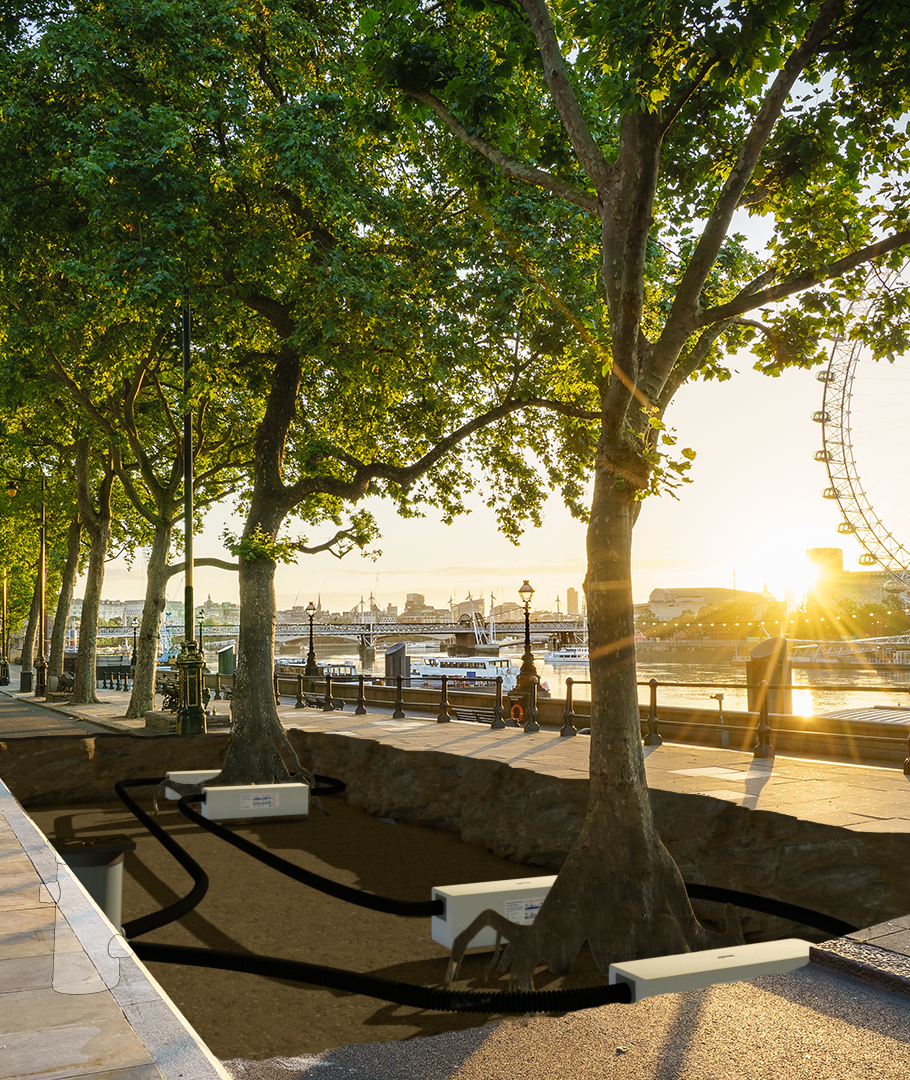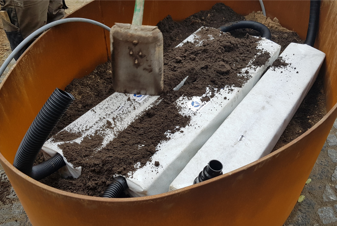 - Puiden yhteydessä – CoreBlue™ muodostaa maanalaisen vesivaraston, joka vapauttaa veden suoraan juuristoon.
