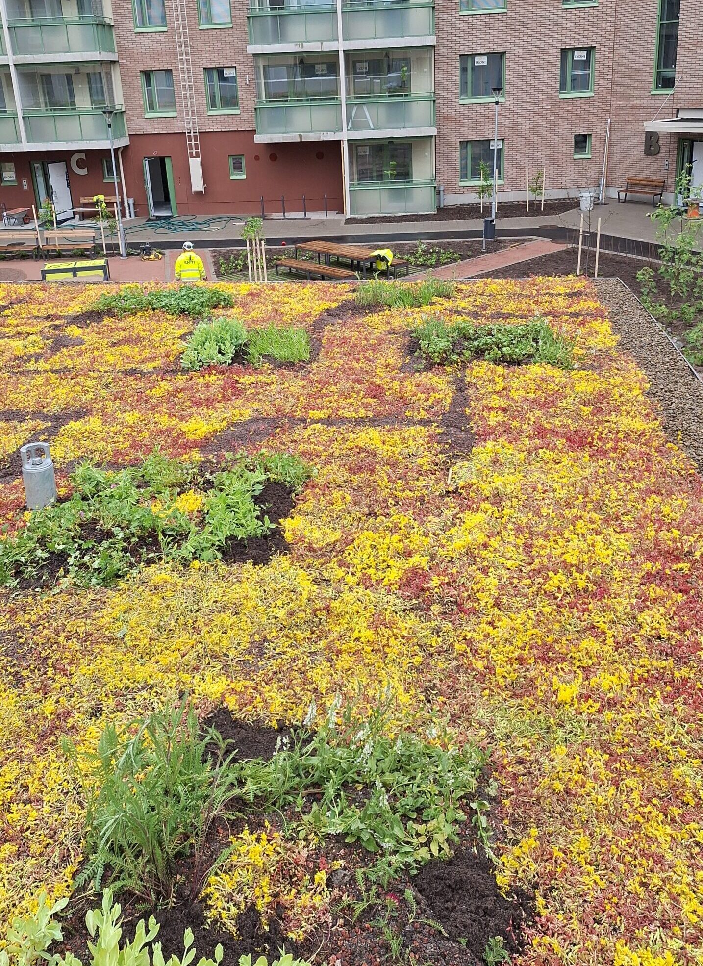 Kattopinnasta saadaan elävämpi ja monimuotoisempi – tarjoten rakennetta, lisää kiinnostusta linnuille ja hyönteisille sekä runsaasti väriä, muotoa ja vaihtelua. Viherkattorakenne pysyy kevyenä, kuivuutta kestävät kasvit vaativat vain vähän hoitoa ja paloturvallisuus on korkea.