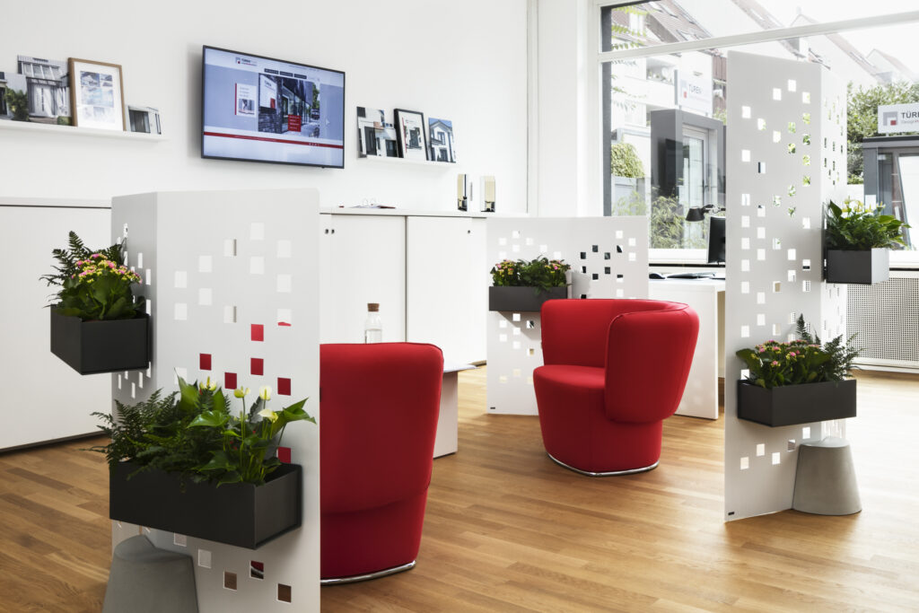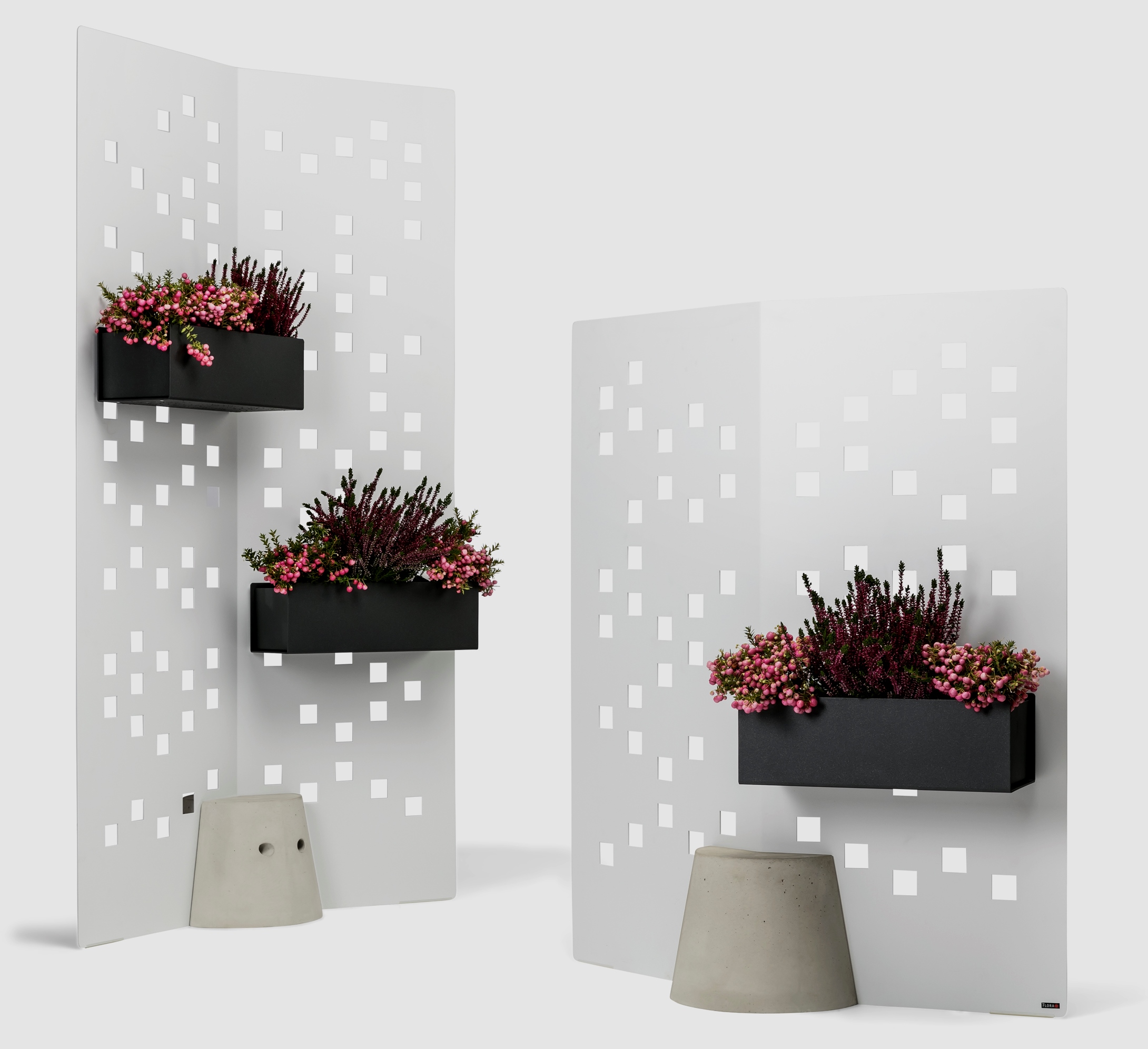 Kahden eri korkeuden ansiosta elementit muodostavat vaihtelevan ja näyttävän siluetin, joka herättää huomiota ja lisää yksityisyyttä. Kahdesta erikokoisesta alumiinielementistä koostuva kevyt ja ilmava rakenne voidaan sijoittaa joustavasti vapaasti seisovien betonijalustojen avulla, mikä takaa hyvän vakauden.