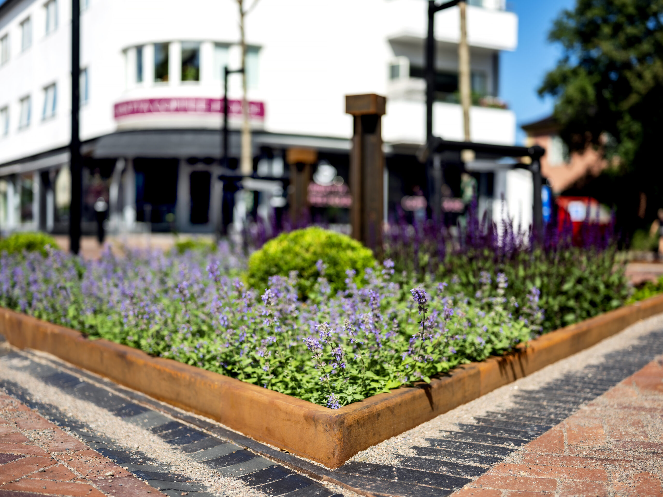 Hyödynnä istutusaltaiden ja reunalistojen geometriaa tilan jäsentämiseen. Selkeät linjat ja harkitut muodot tukevat koko ympäristön ilmettä.