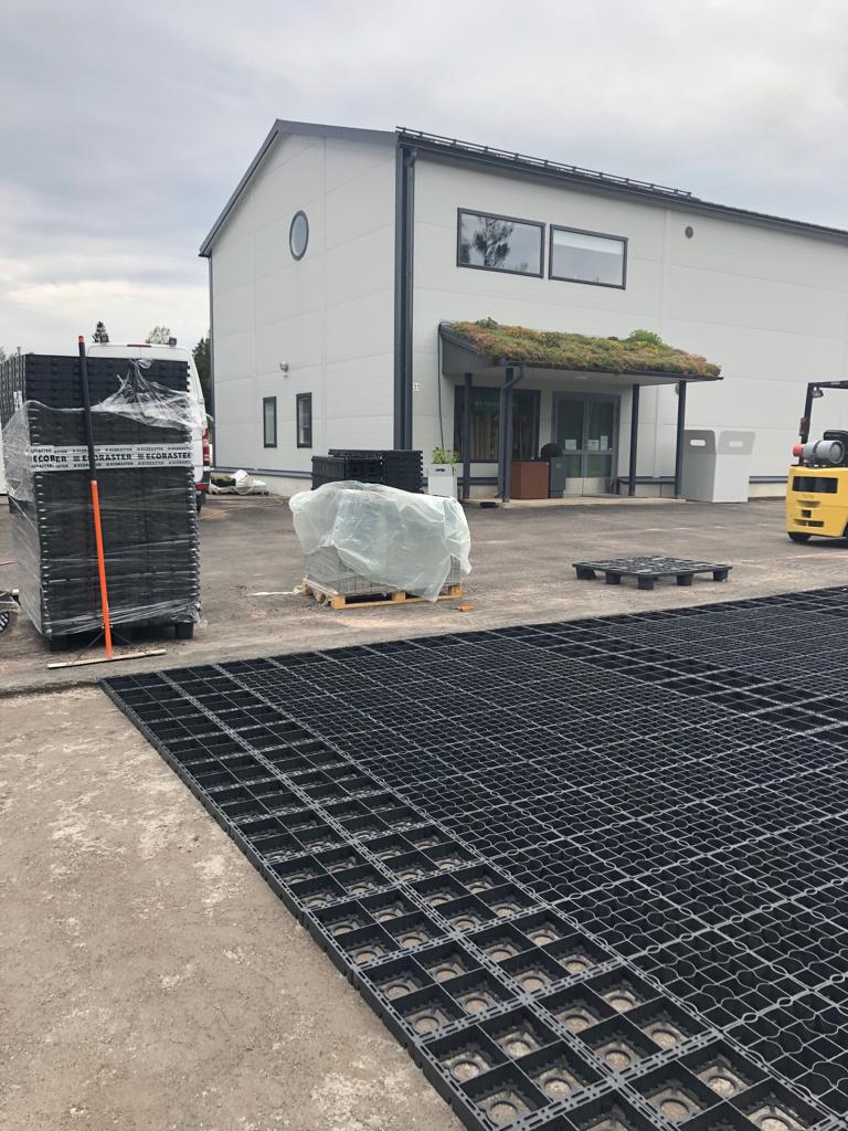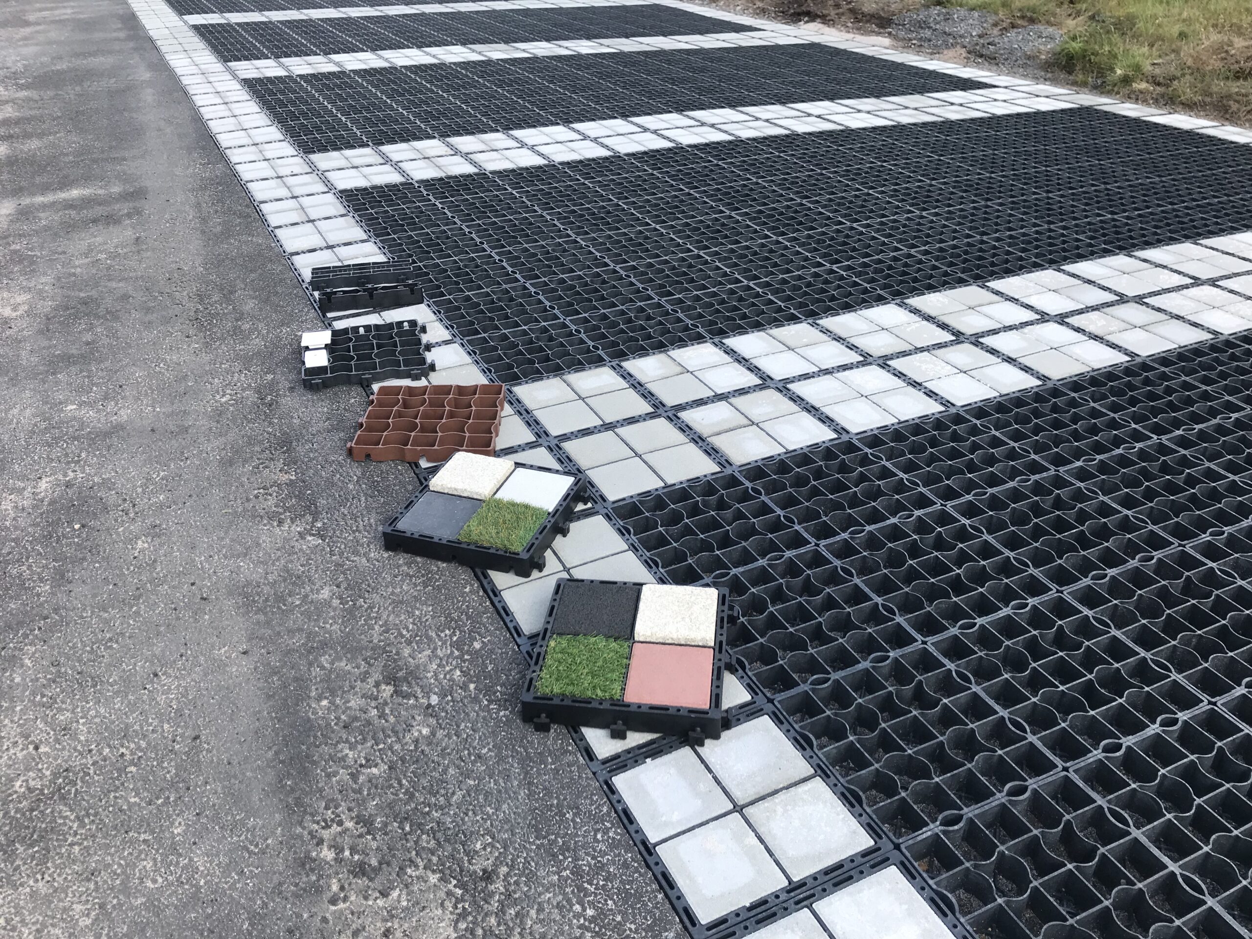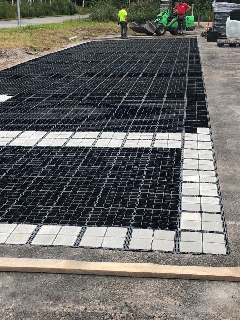 Ecoraster maakennosto on täytetty murskeella ja EcoBloxx maakennosto betonikivillä.