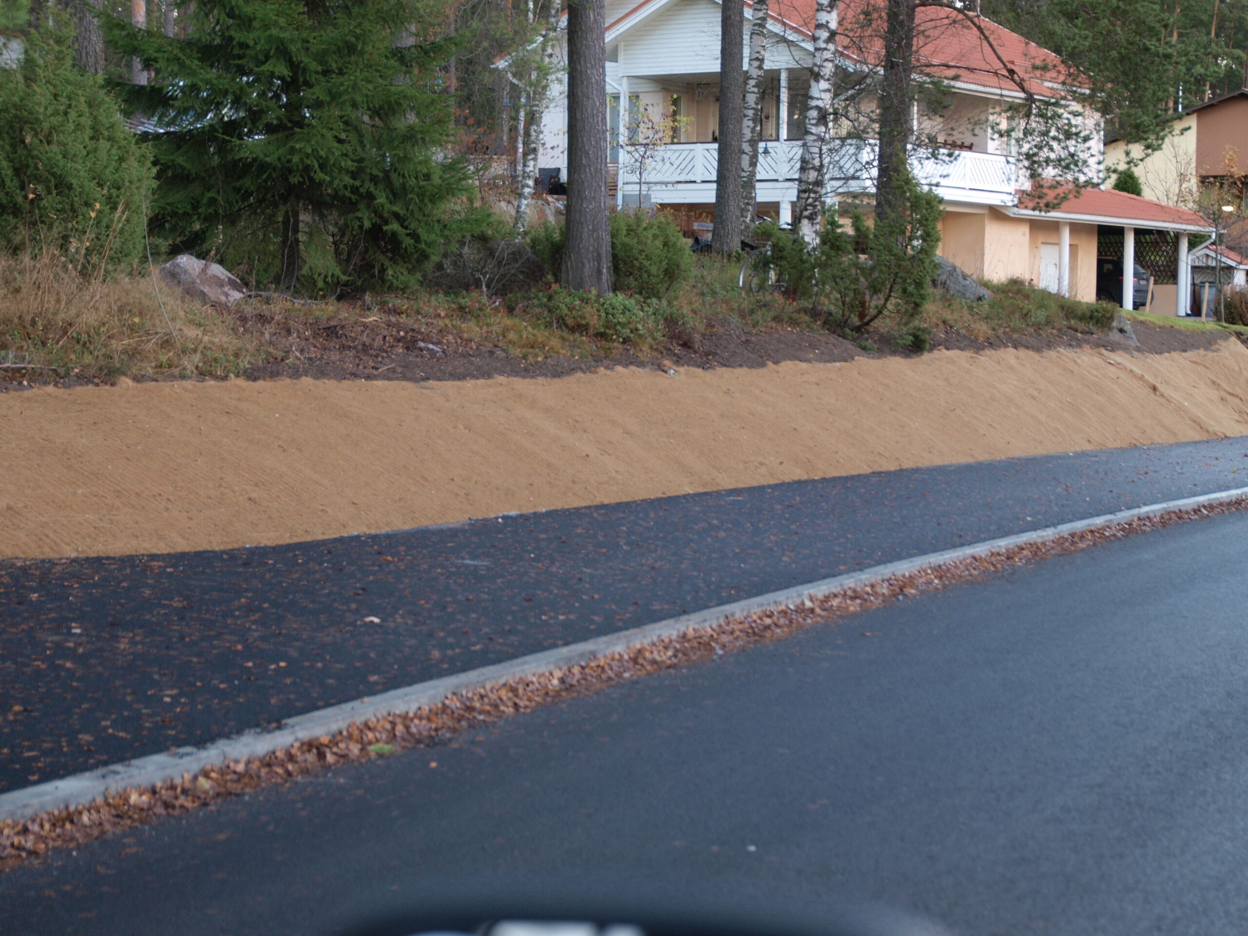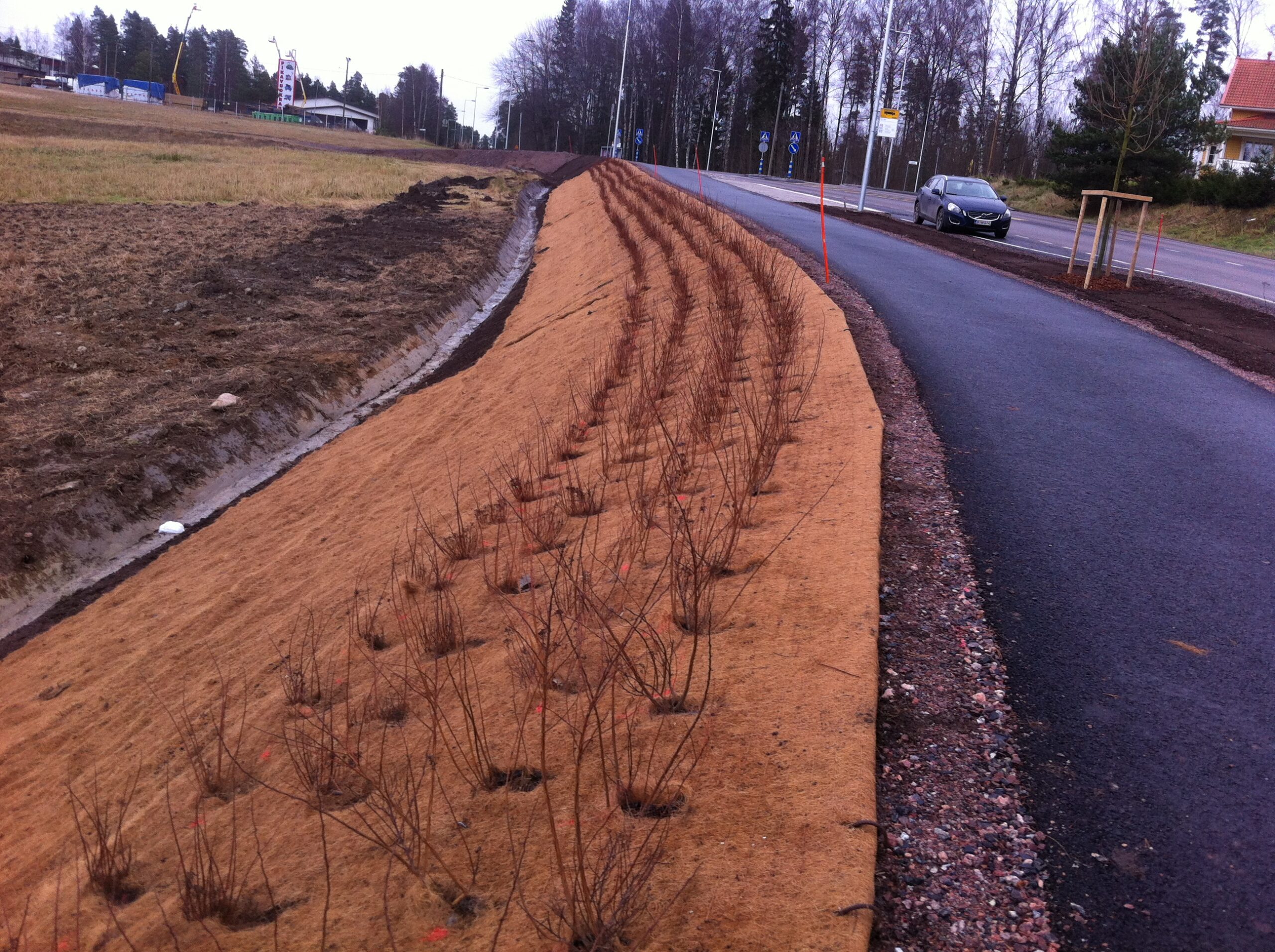 Vantaalla on tuettu eroosiomatolla uuden ojan rakennetta Greenfix 7 eroosiomatolla ja istutusalueita tienreunalla Greenfix 9 pensaseroosiomatolla.