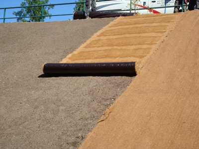 Luiska-alueiden suojaus Greenfix 9 pensaseroosiomatolla. Pensaseroosiomatto on asennettu Soilweb luiskakennoston päälle suojaamaan rinnettä pintaeroosiolta ja optimoimaan pensaiden kasvua. Luiskakennosto asennettu pensaseroosiomaton alle tieliittymästä johtuvan vedentulon/maasortuman vuoksi.