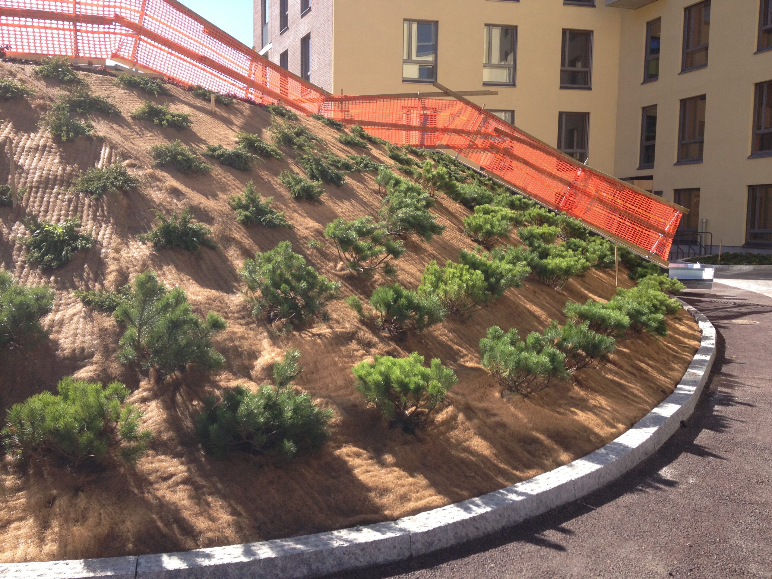 Uuden pensasistutusalueen pintaeroosion hallinta ja pensaiden kasvun edistäminen pensaseroosiomatolla Greenfix 9.
