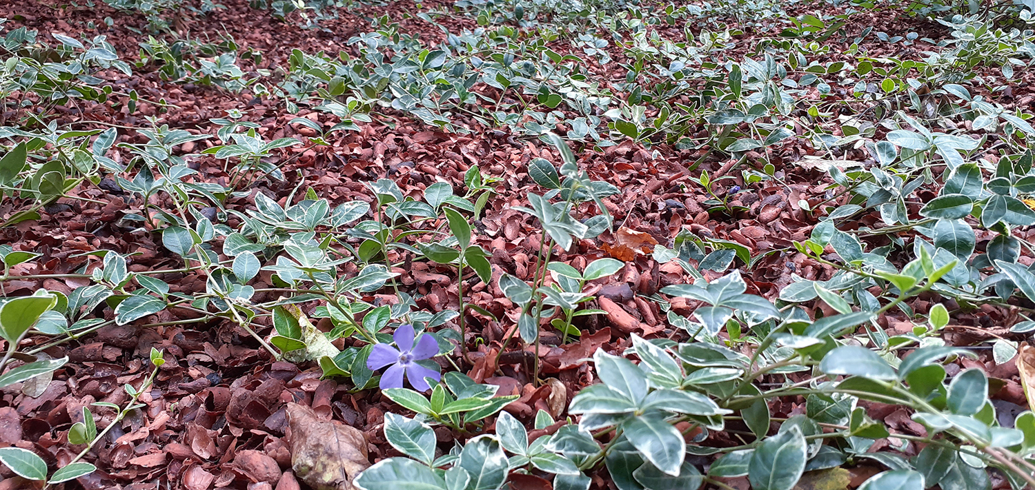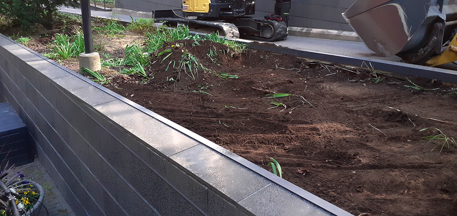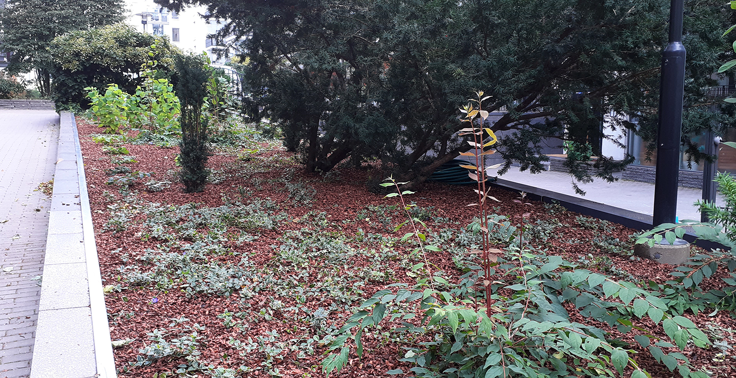 Istutusaltaan vanha maanpinta kuorittiin ja kaksi marjakuusta säästettiin. Istutusalueelle asennettiin Eg Bio Weed rikkaruohonestomattoa ja kaakaokuorikatetta.