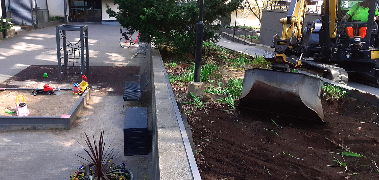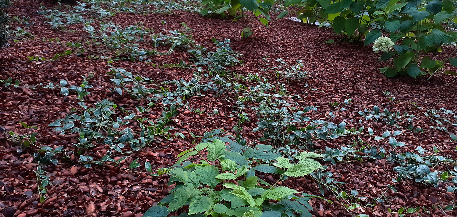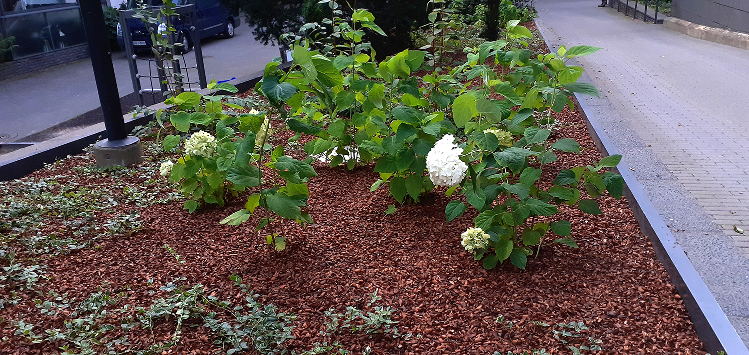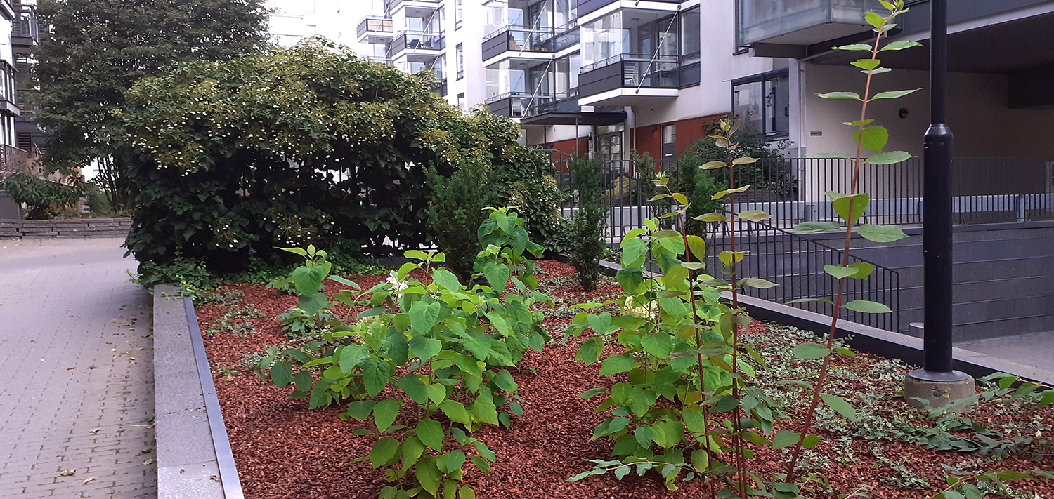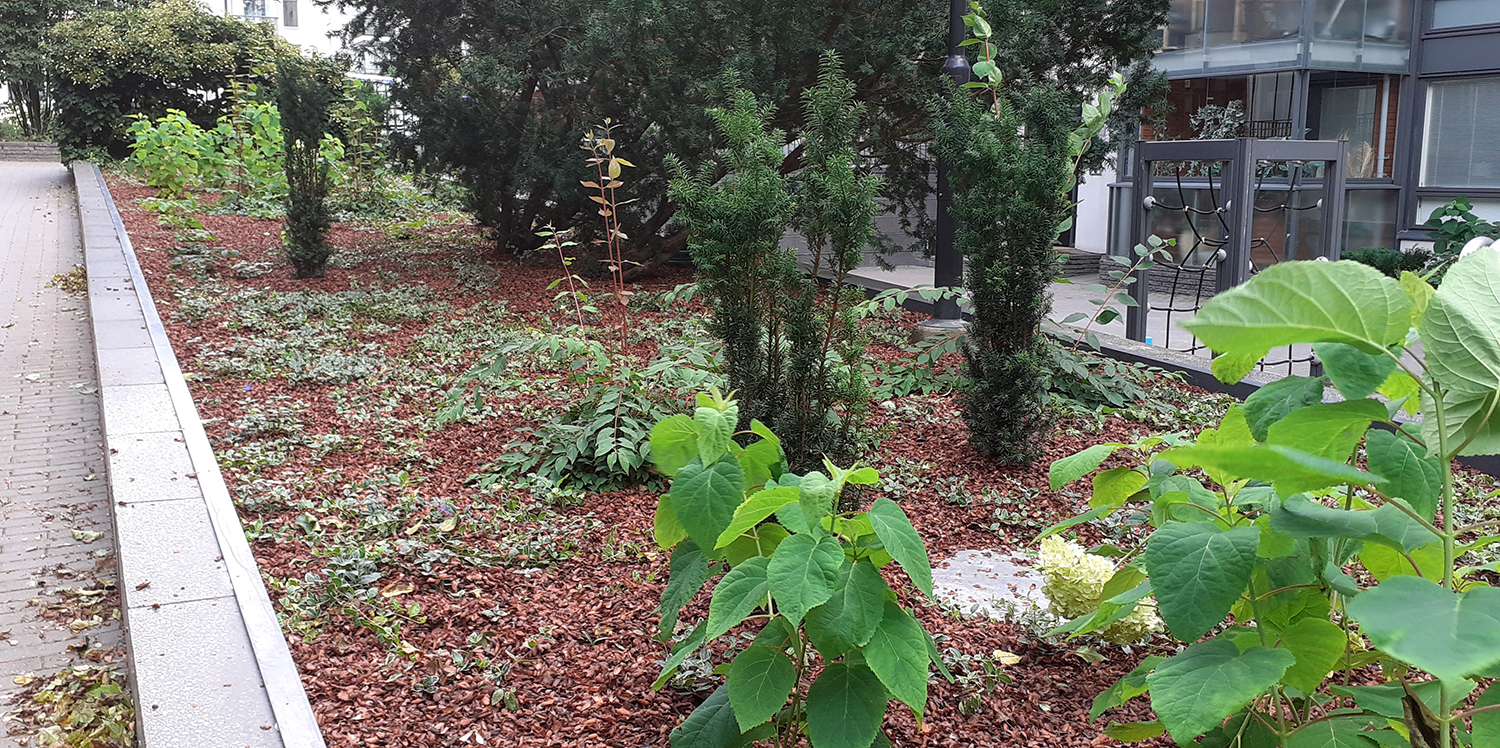 Istutusaltaan vanha maanpinta kuorittiin ja kaksi marjakuusta säästettiin. Istutusalueelle asennettiin Eg Bio Weed rikkaruohonestomattoa ja kaakaokuorikatetta.