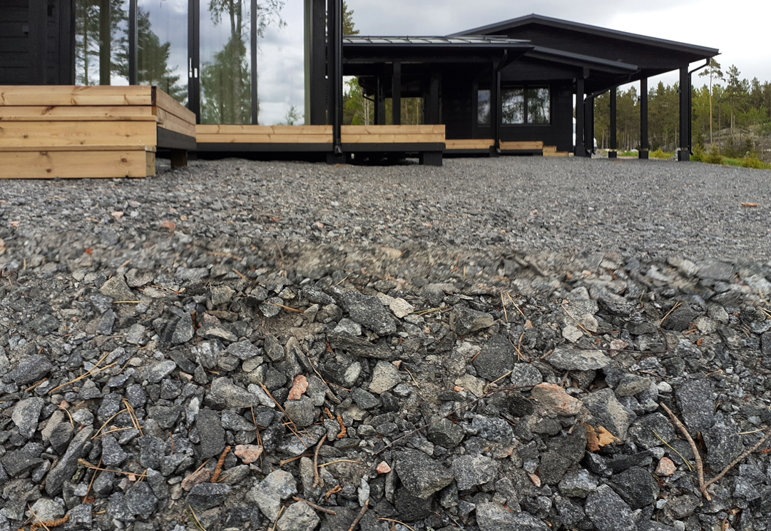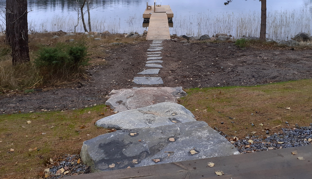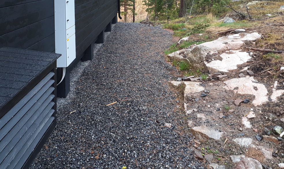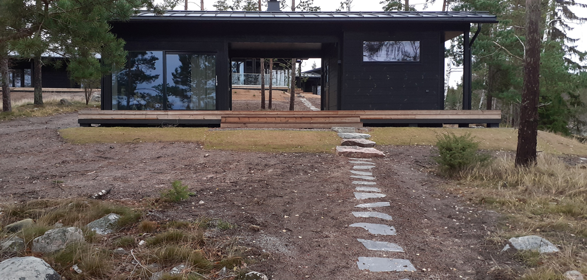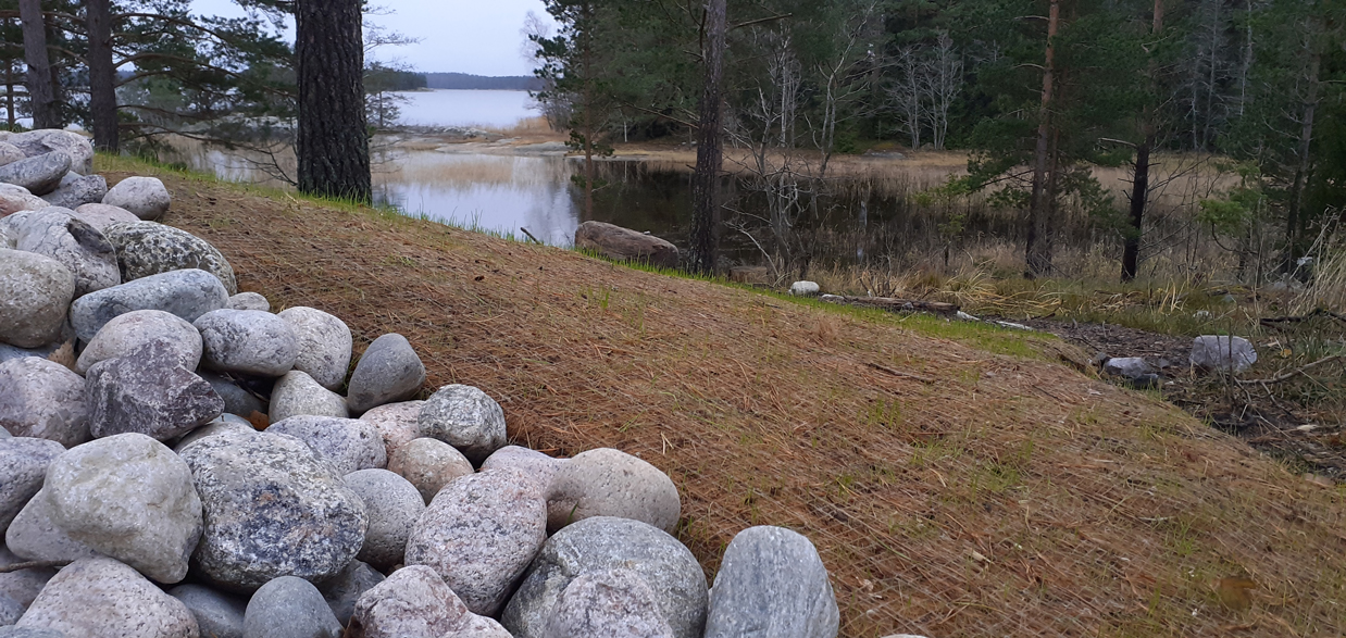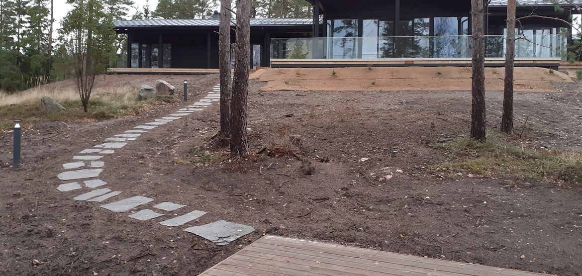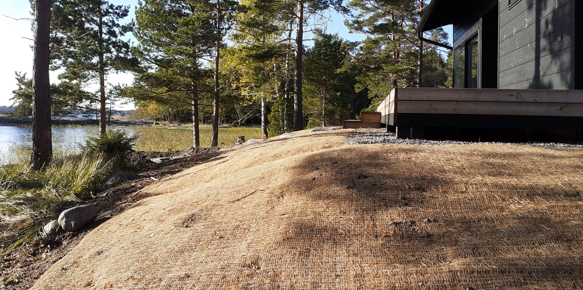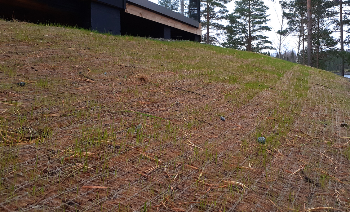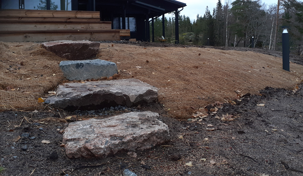 Suunnitelman tavoitteena oli maisemoida vapaa-ajan asunnon ympäristö rakennustyömaan jäljiltä. Eroosiosuojaksi asennettiin Greenfix Covamat siemeneroosiomattoa niittysiemenellä.