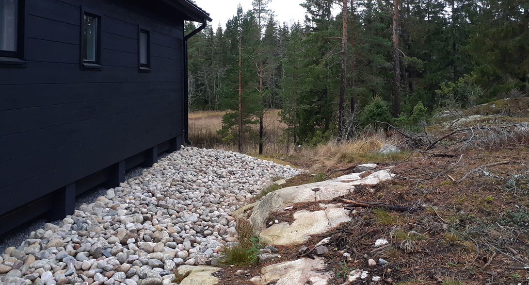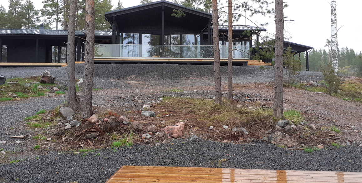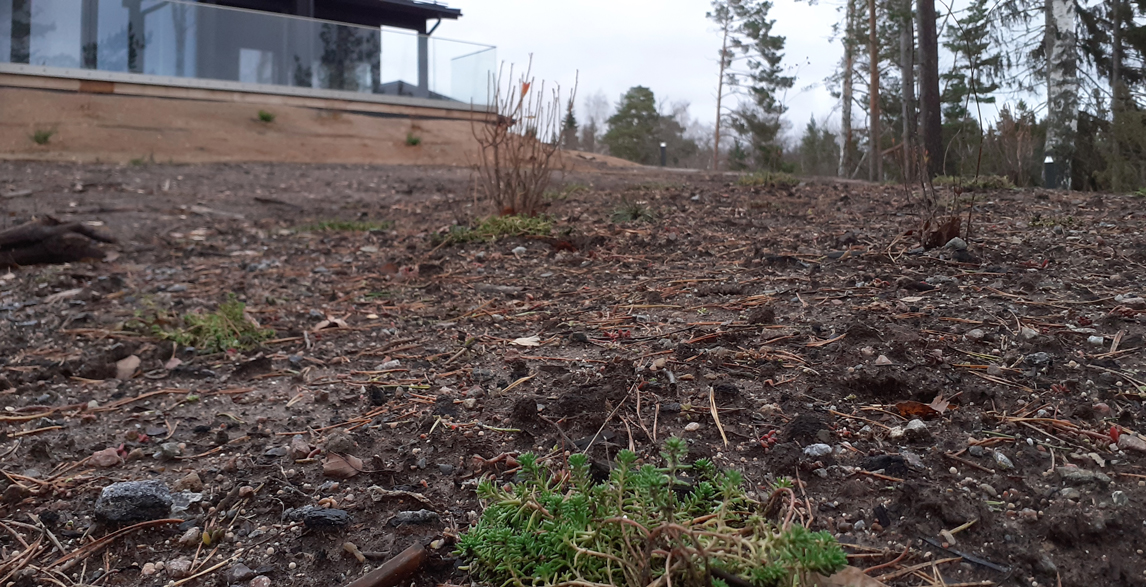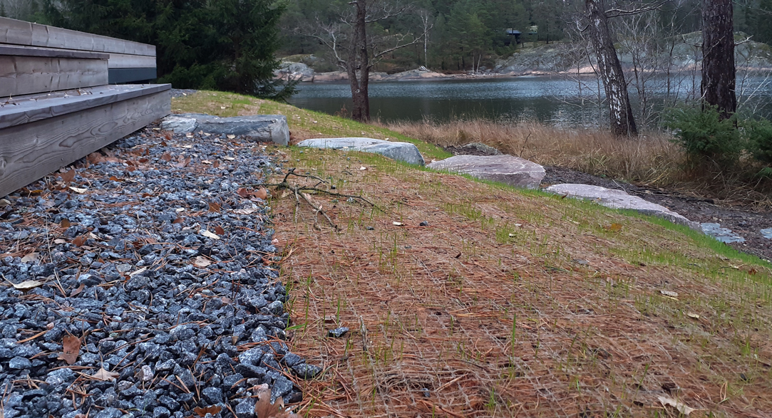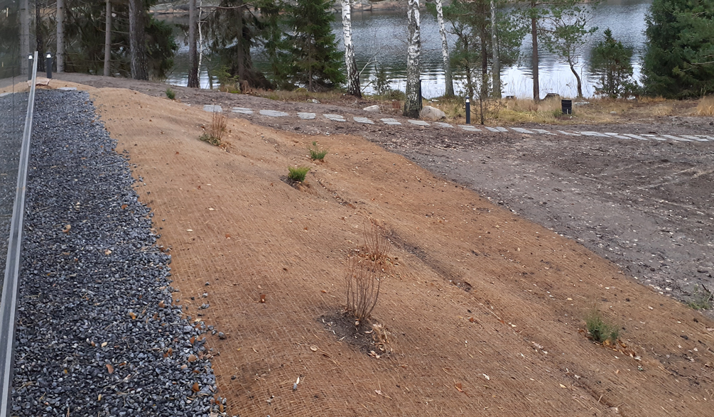Suunnitelman tavoitteena oli maisemoida vapaa-ajan asunnon ympäristö rakennustyömaan jäljiltä. Eroosiosuojaksi asennettiin Greenfix Covamat siemeneroosiomattoa niittysiemenellä.