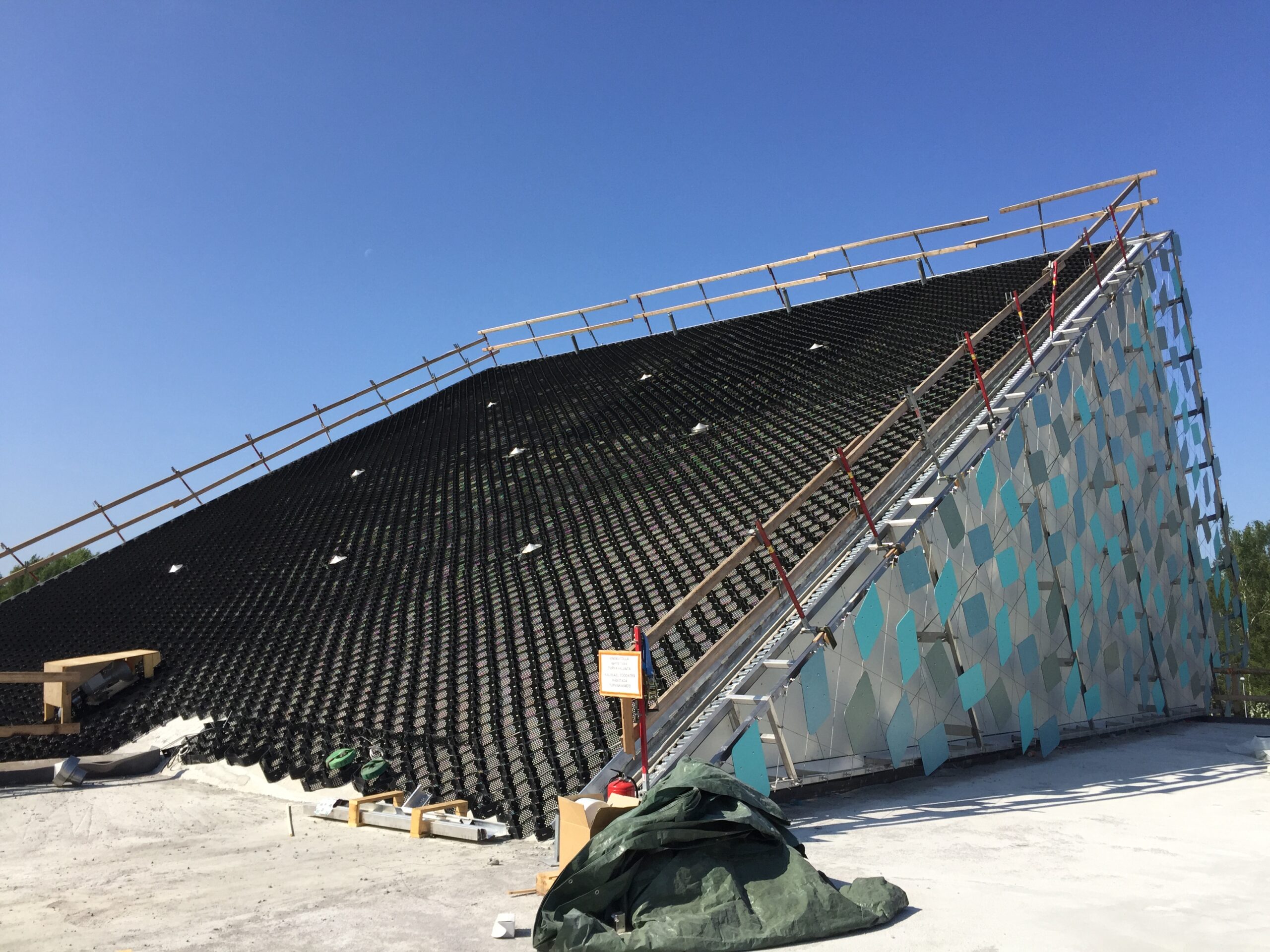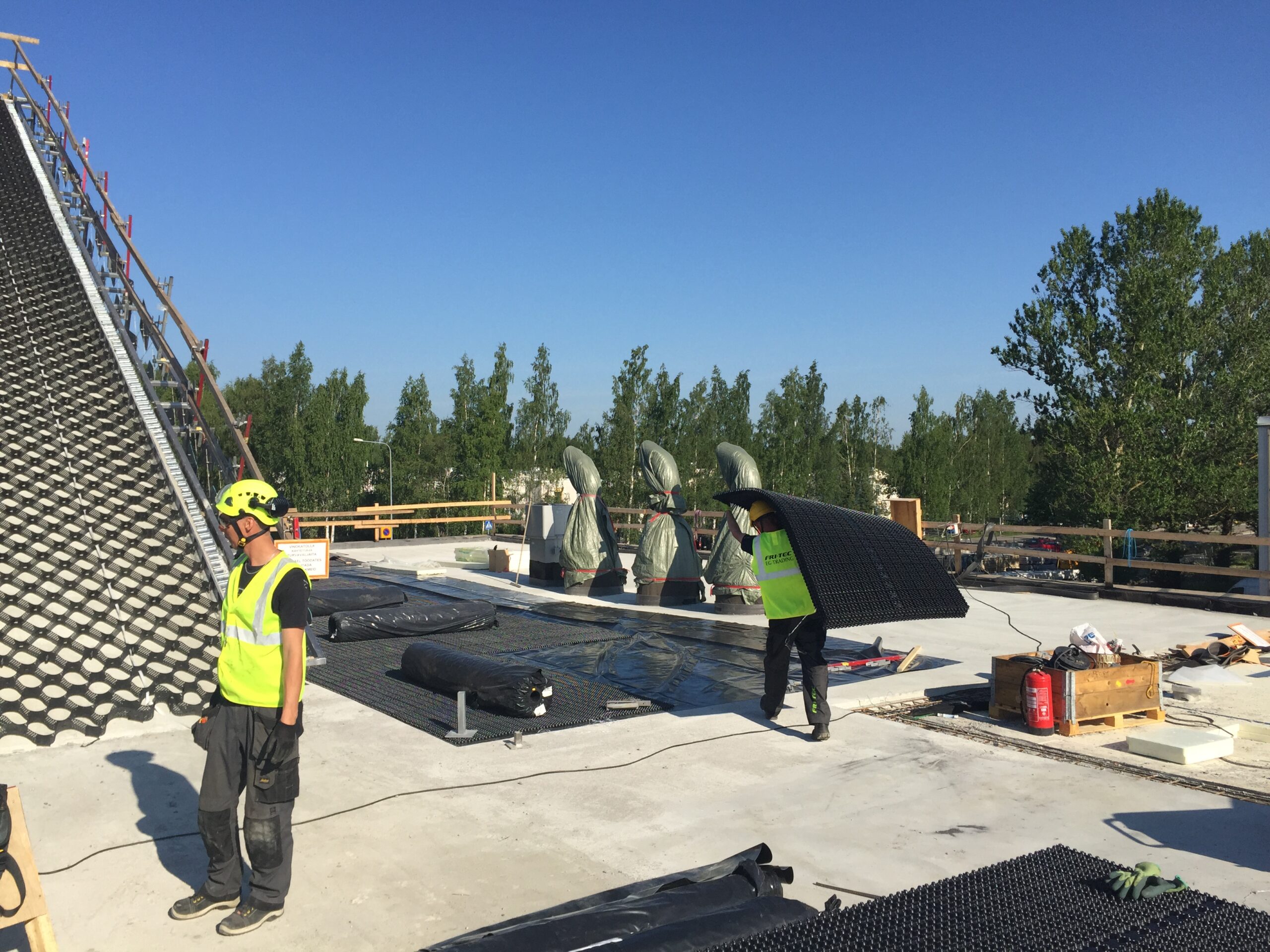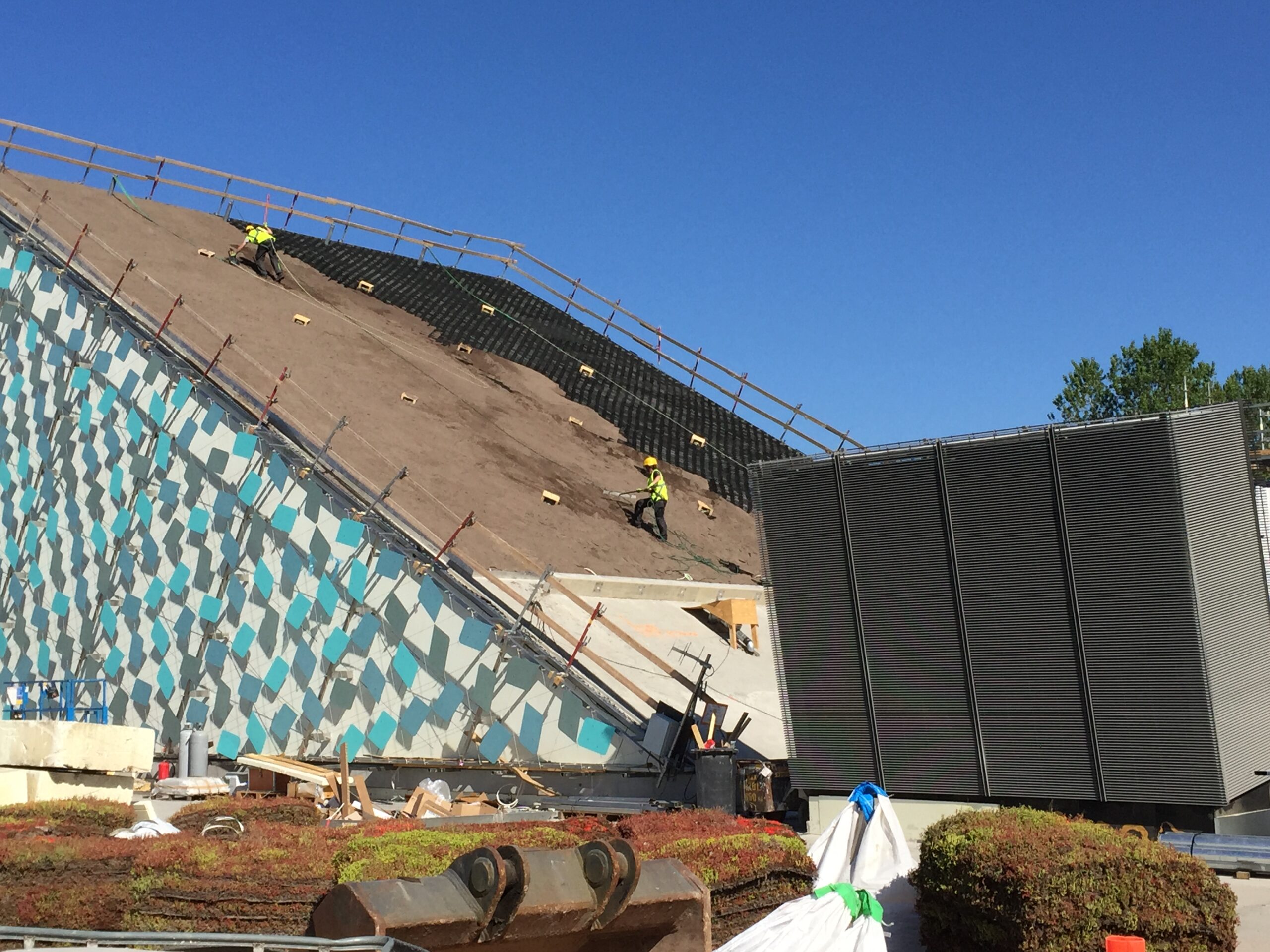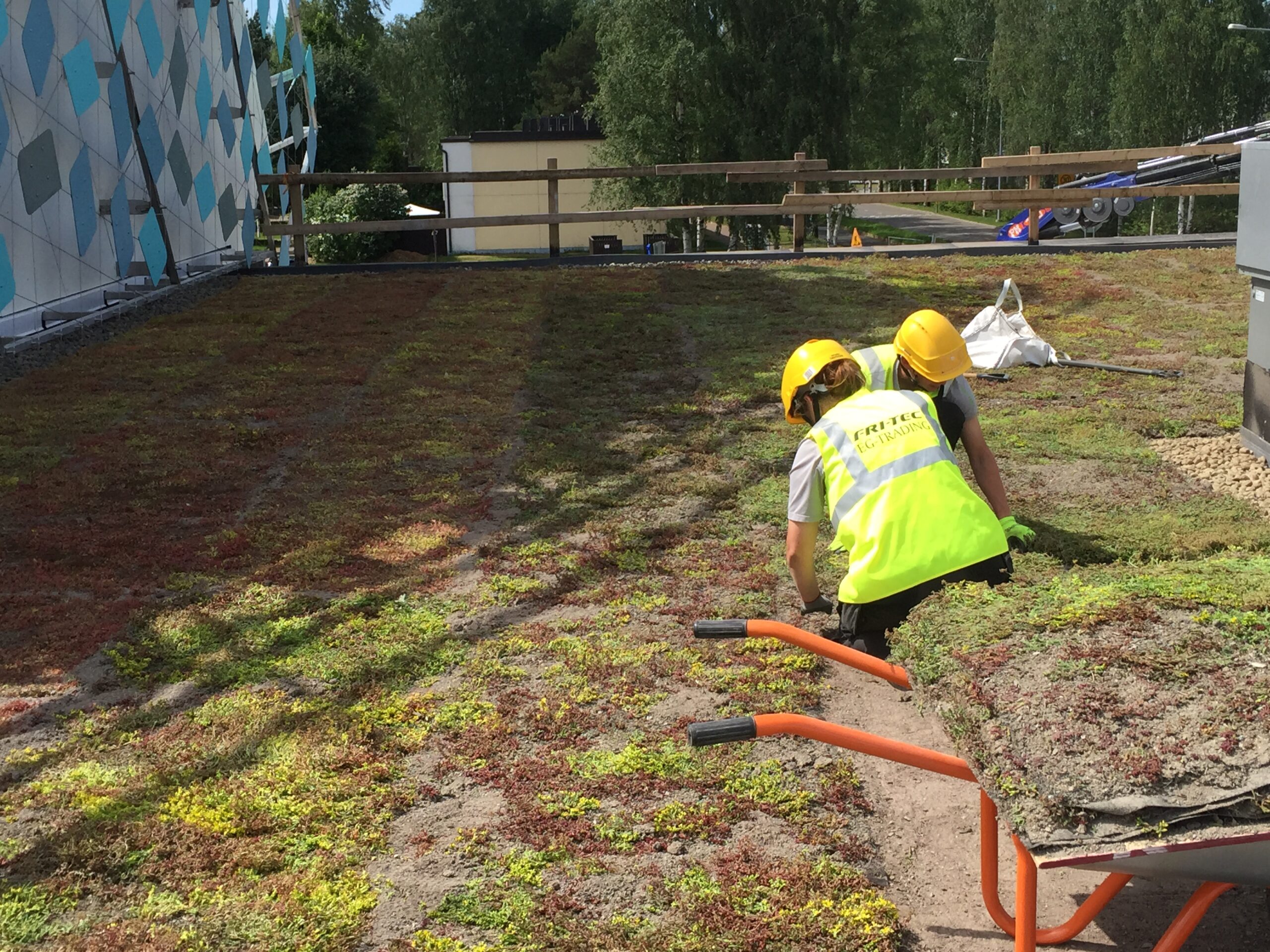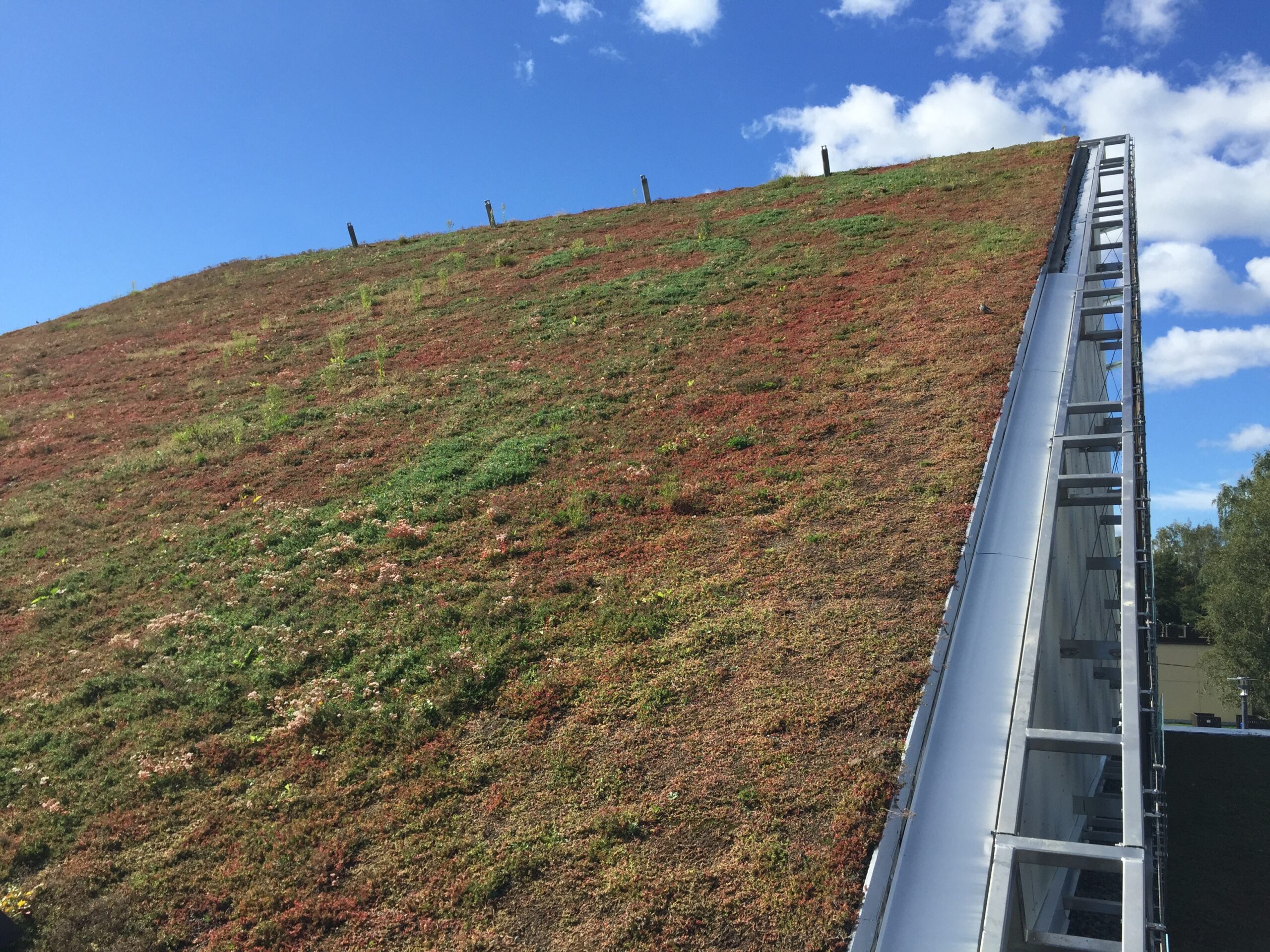 Jyrkkä viherkatto. Kohteessa käytetty Soilweb-kennostoja, Diadem-tuotteita sekä Nordic Green Roof® maksaruohomattoa.