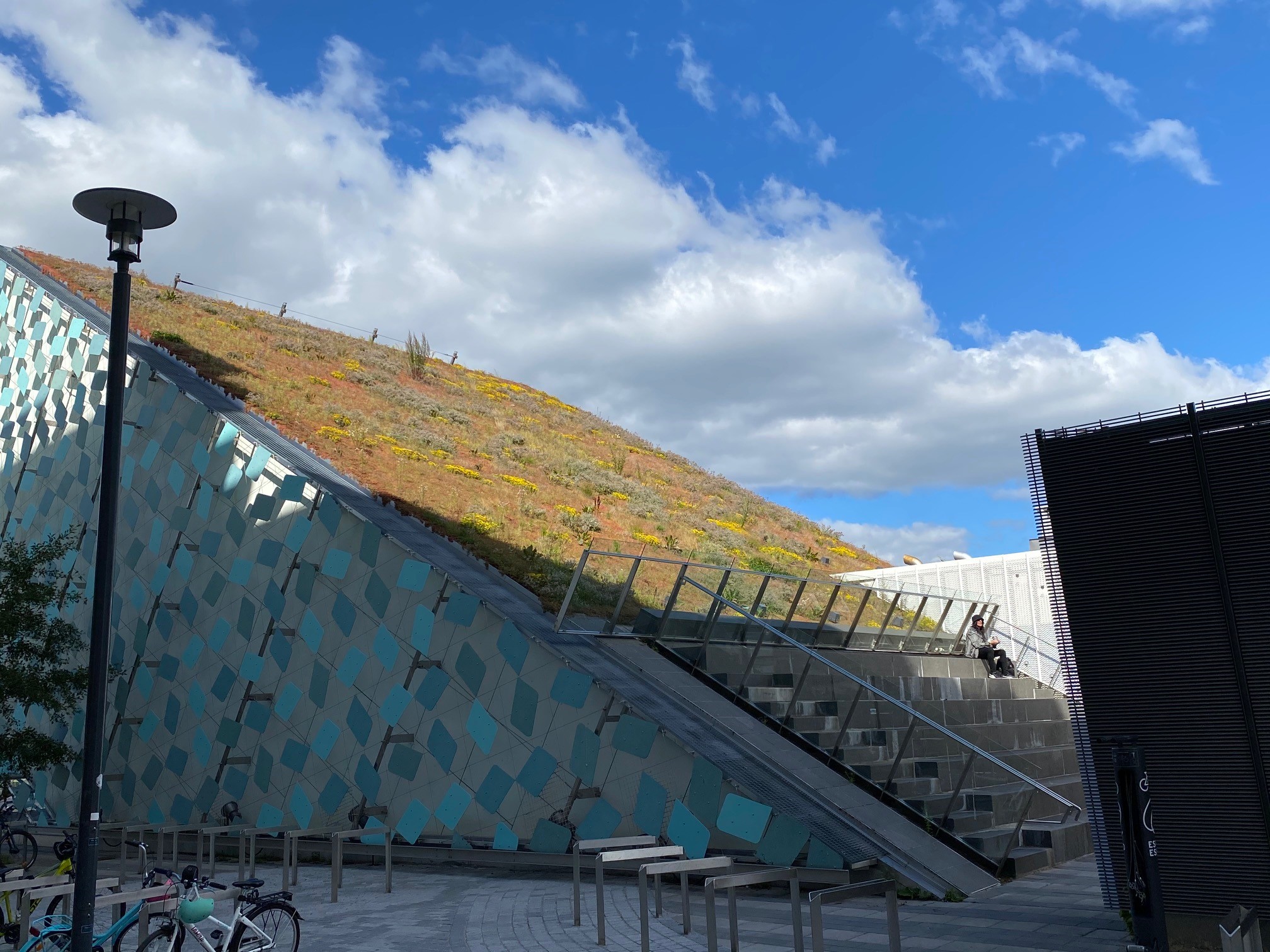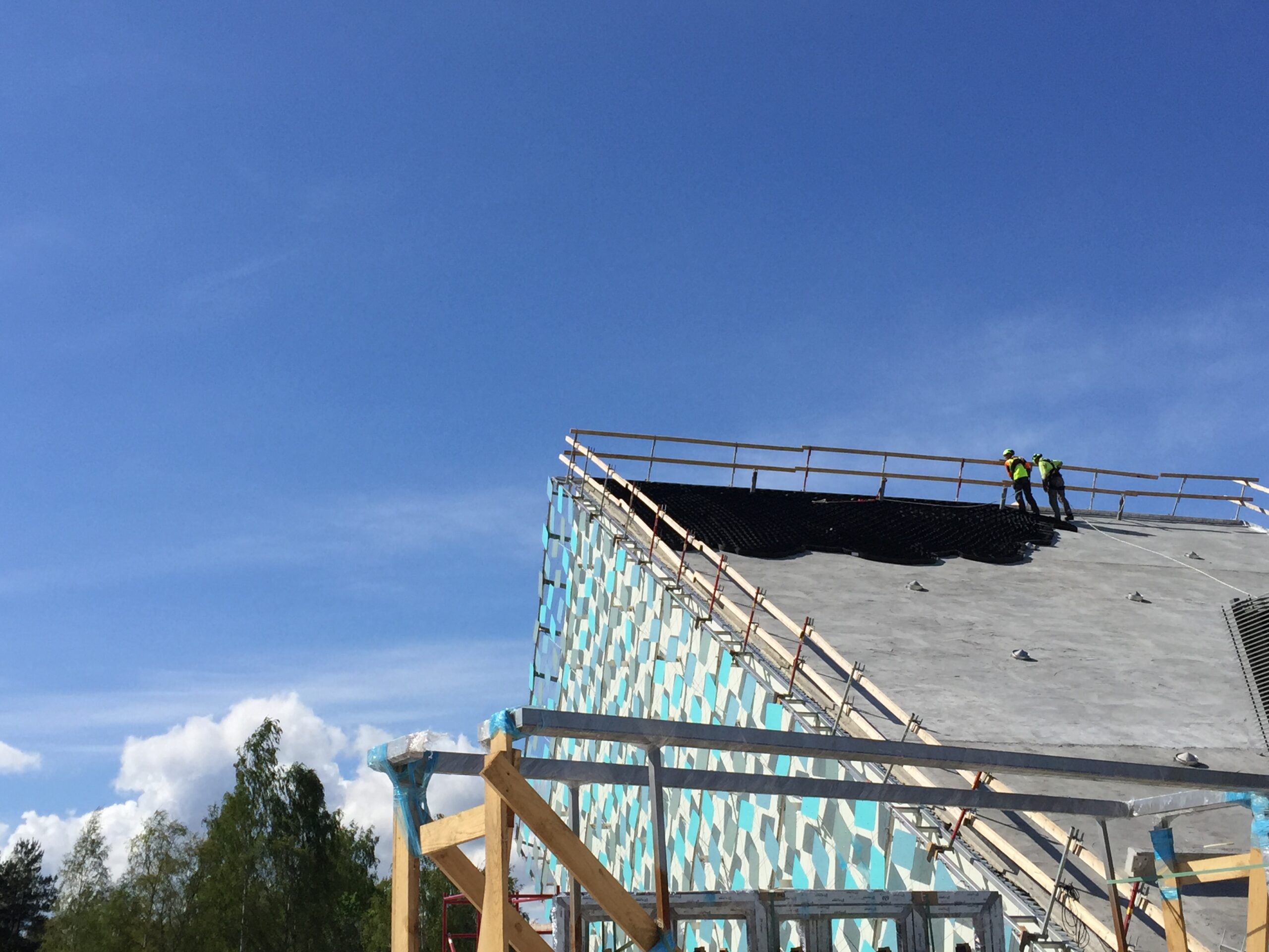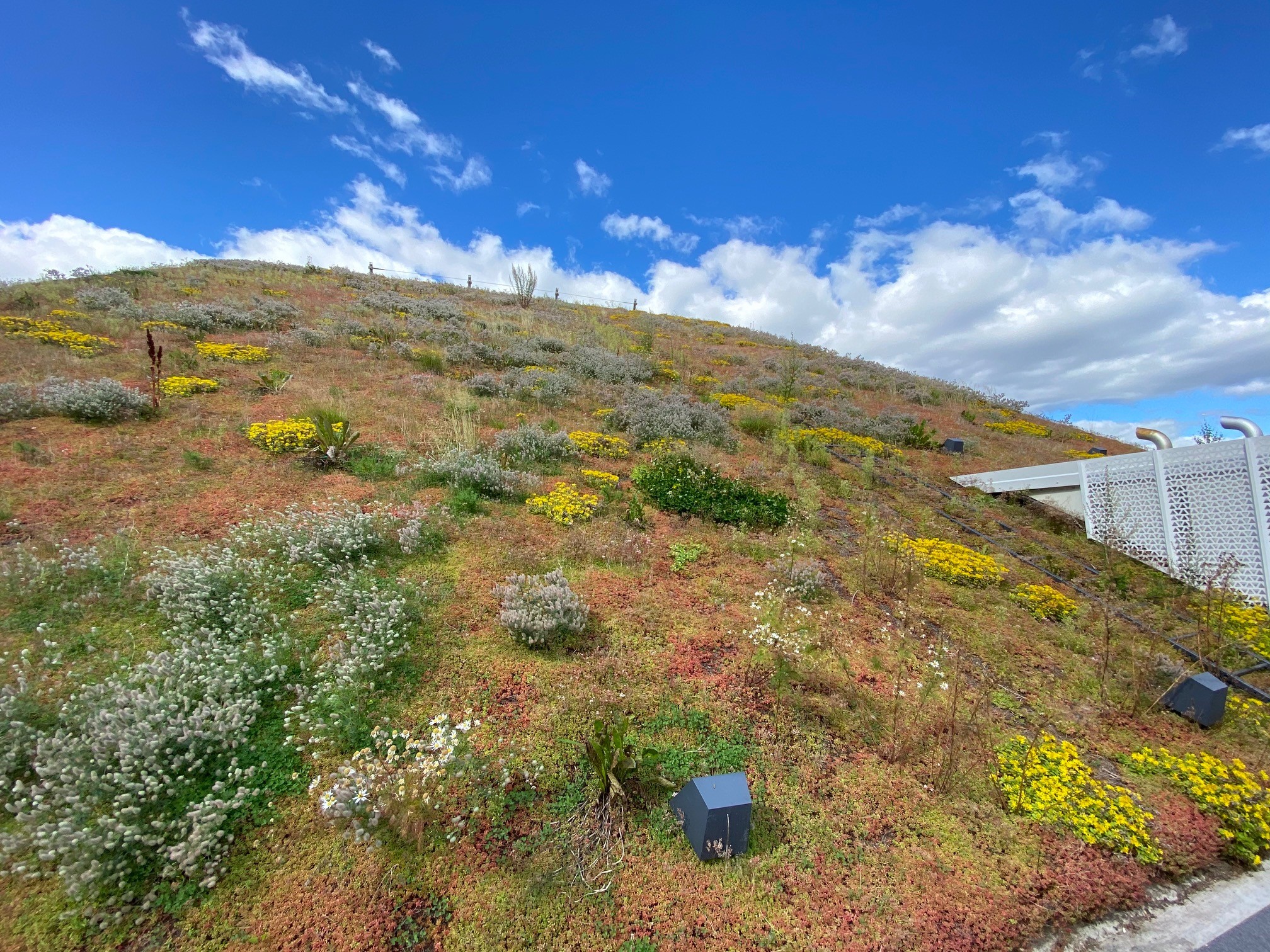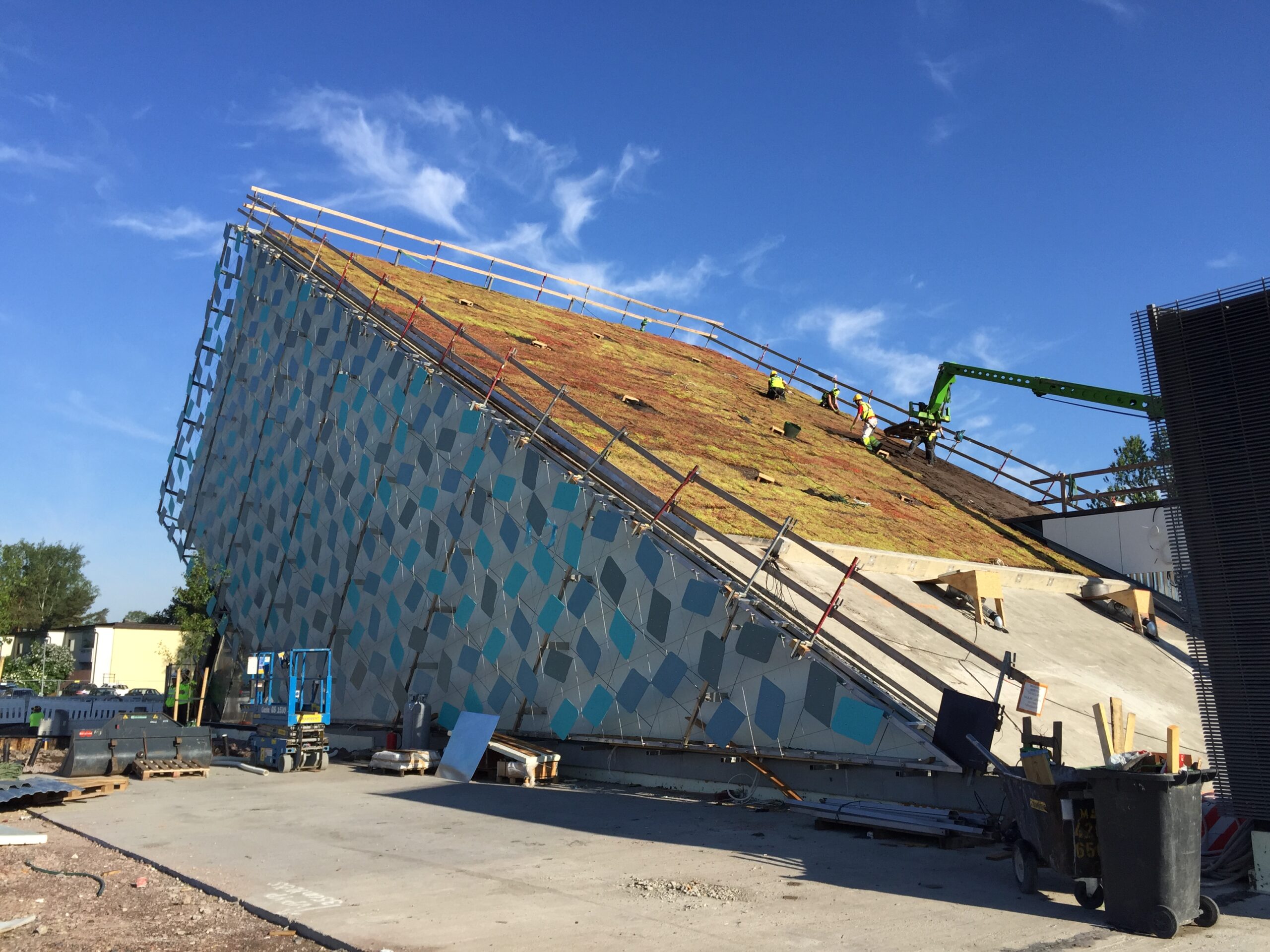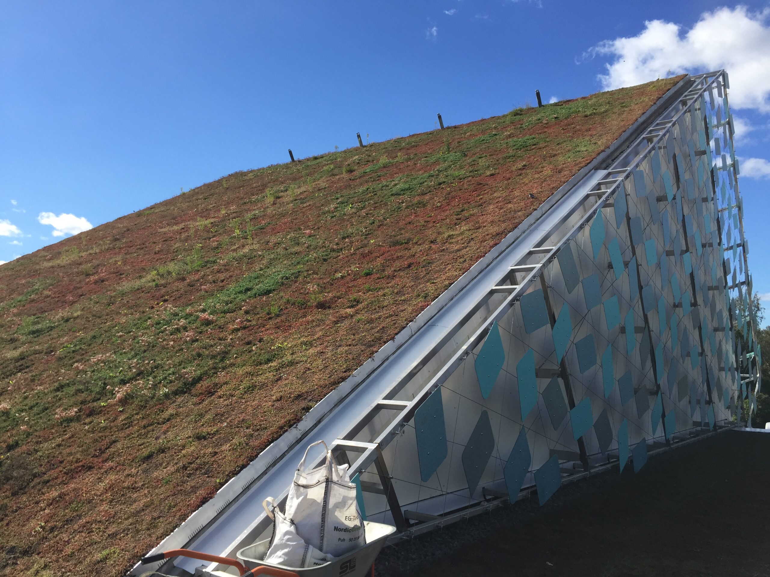 Jyrkkä viherkatto. Kohteessa käytetty Soilweb-kennostoja, Diadem-tuotteita sekä Nordic Green Roof® maksaruohomattoa.