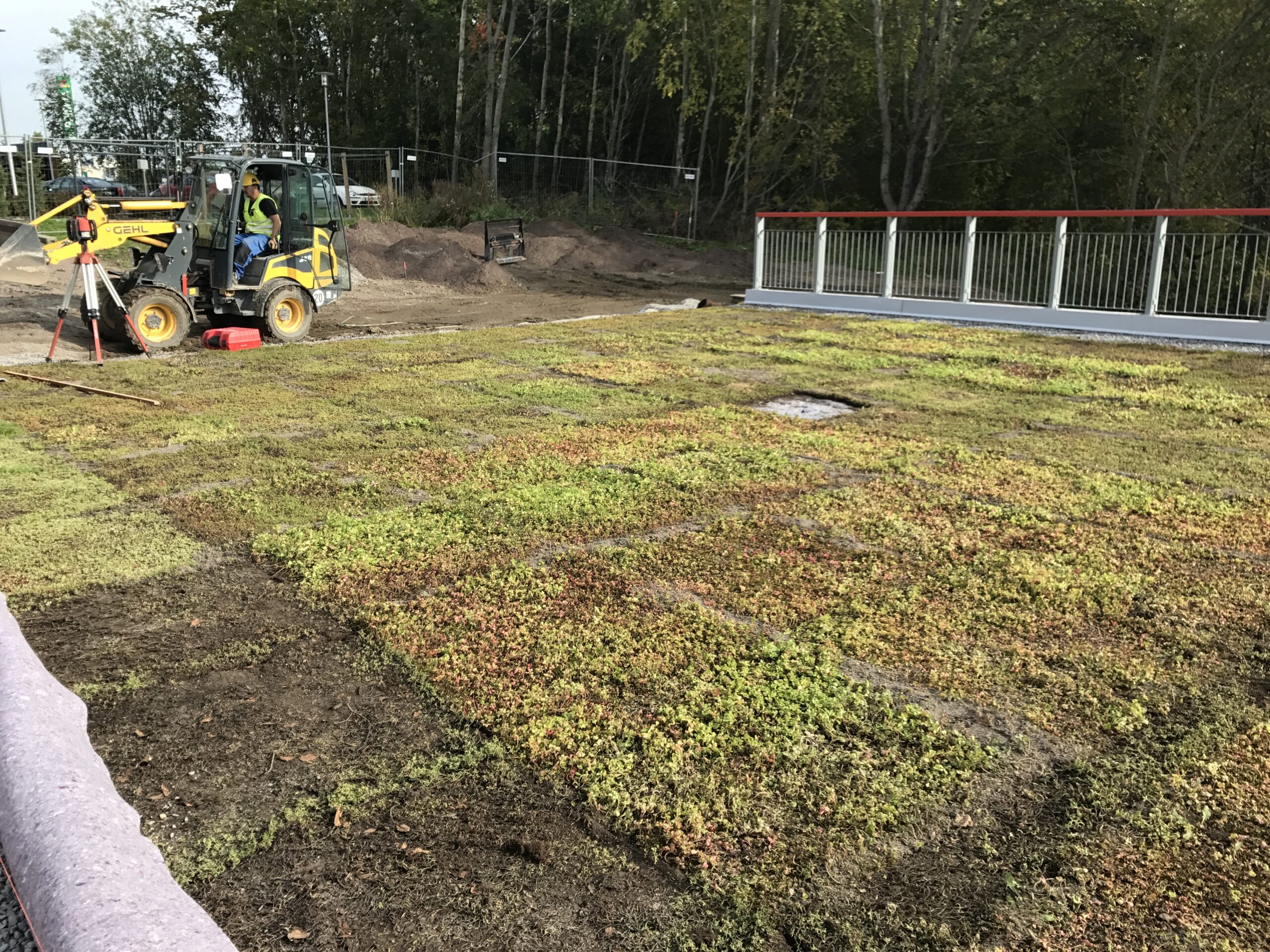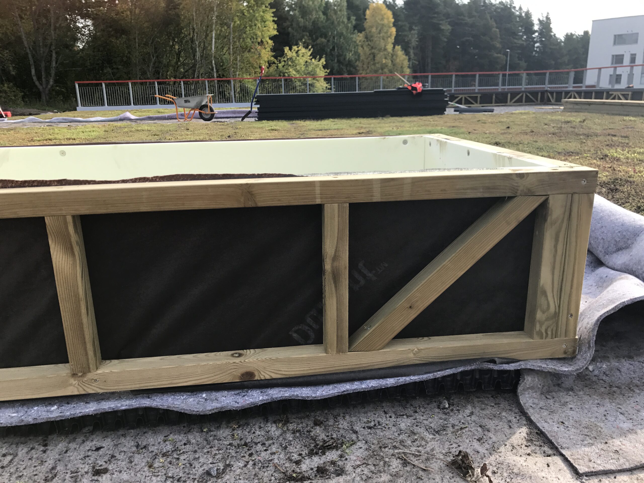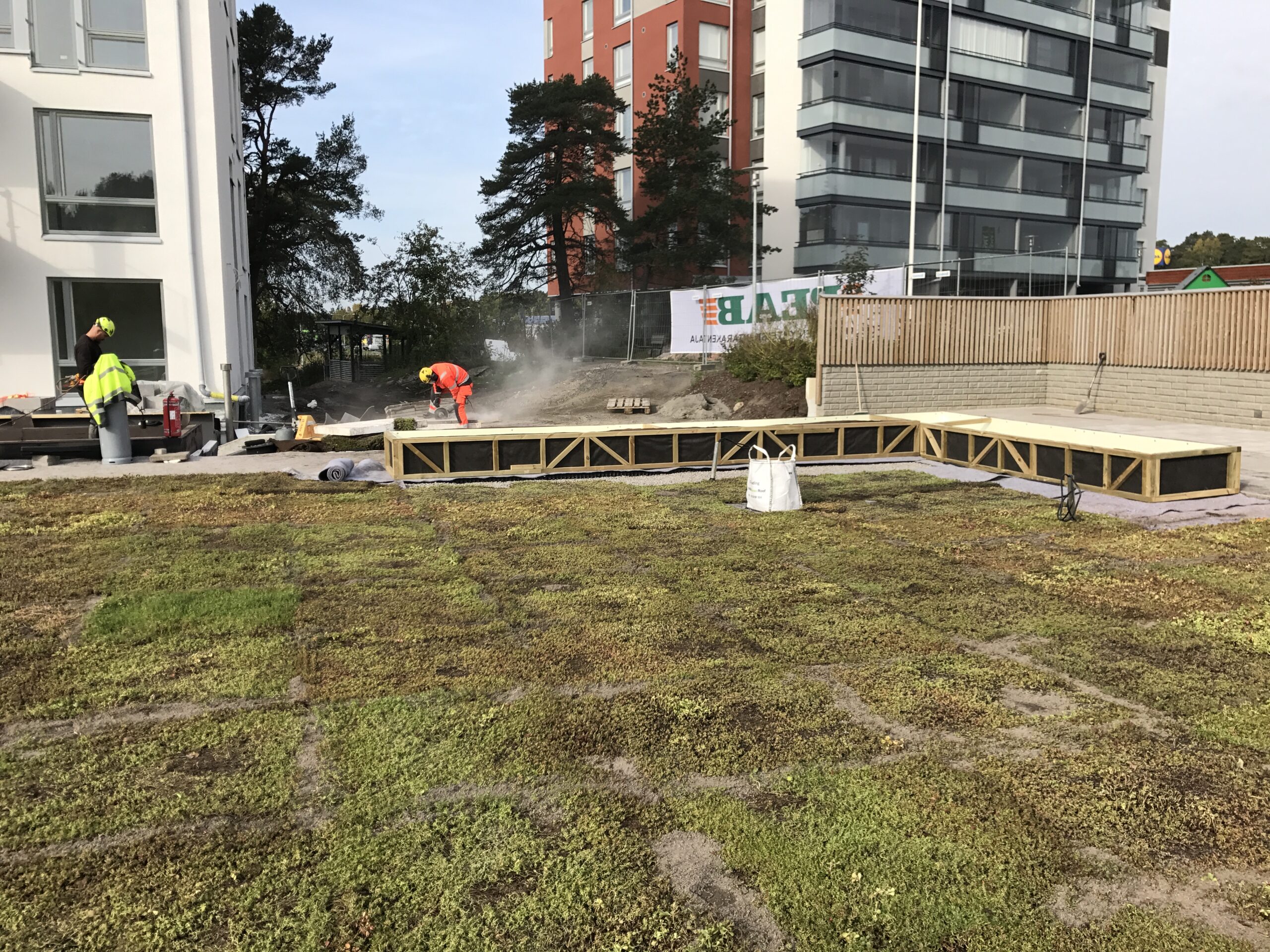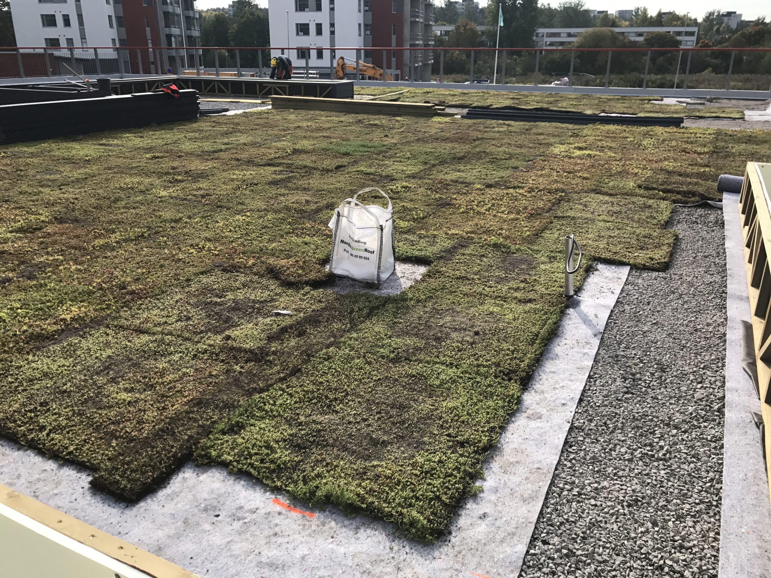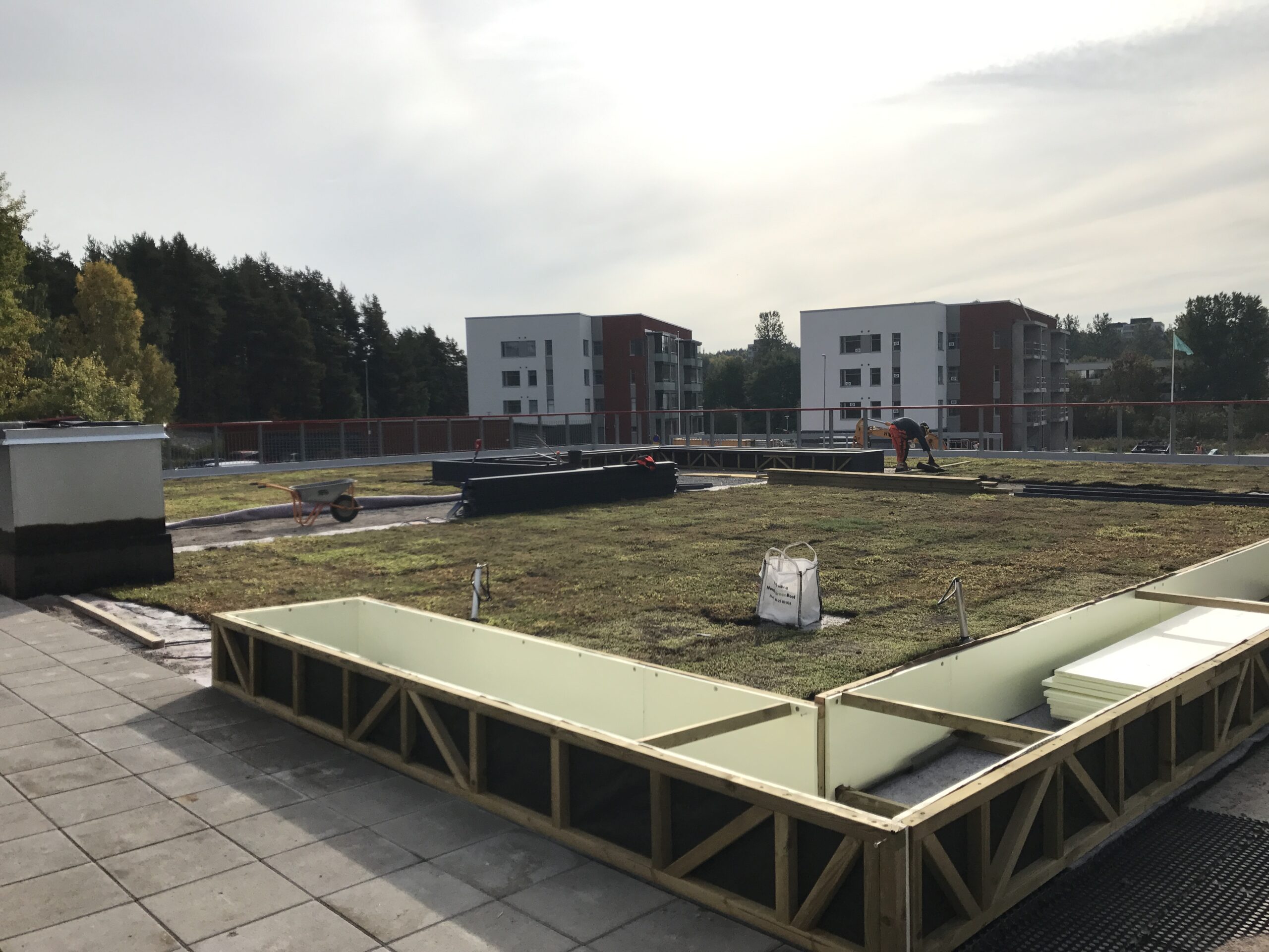 Kohteessa Nordic Green Roof® maksaruohoviherkatto, Diadem kattopuutarhakennot Diadrain 25 sekä Diadem KSE tarkistuslaatikot, istutusaltaissa käytetty Diadem Diadrain 40 kennoja ja Plantex maakatekangasta.