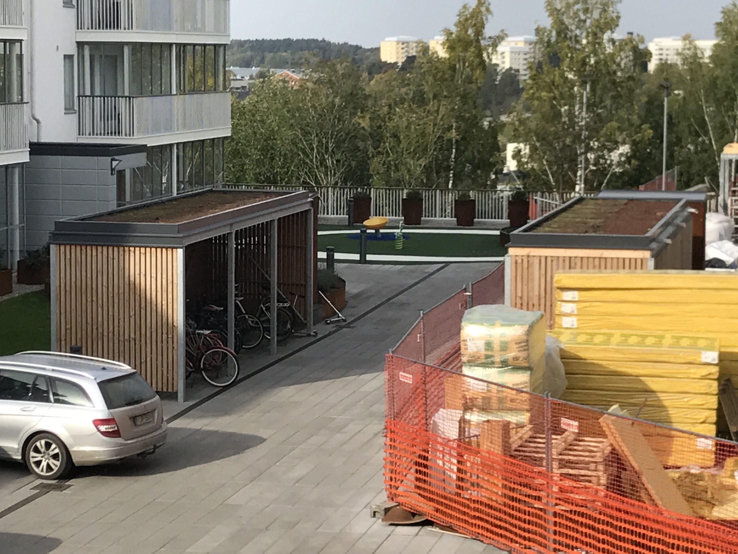 Nordic Green Roof® maksaruohoviherkatot piharakennusten katoilla, köynnösvaijereita sekä Milfordin Corten-teräs istutusaltaita.