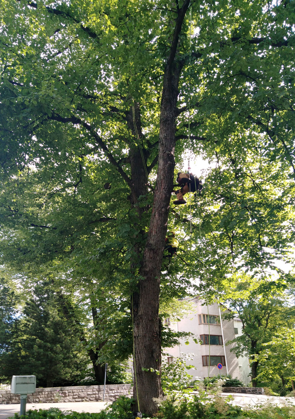Puun poisto kiipeilytekniikoita ja henkilönostinta käyttäen