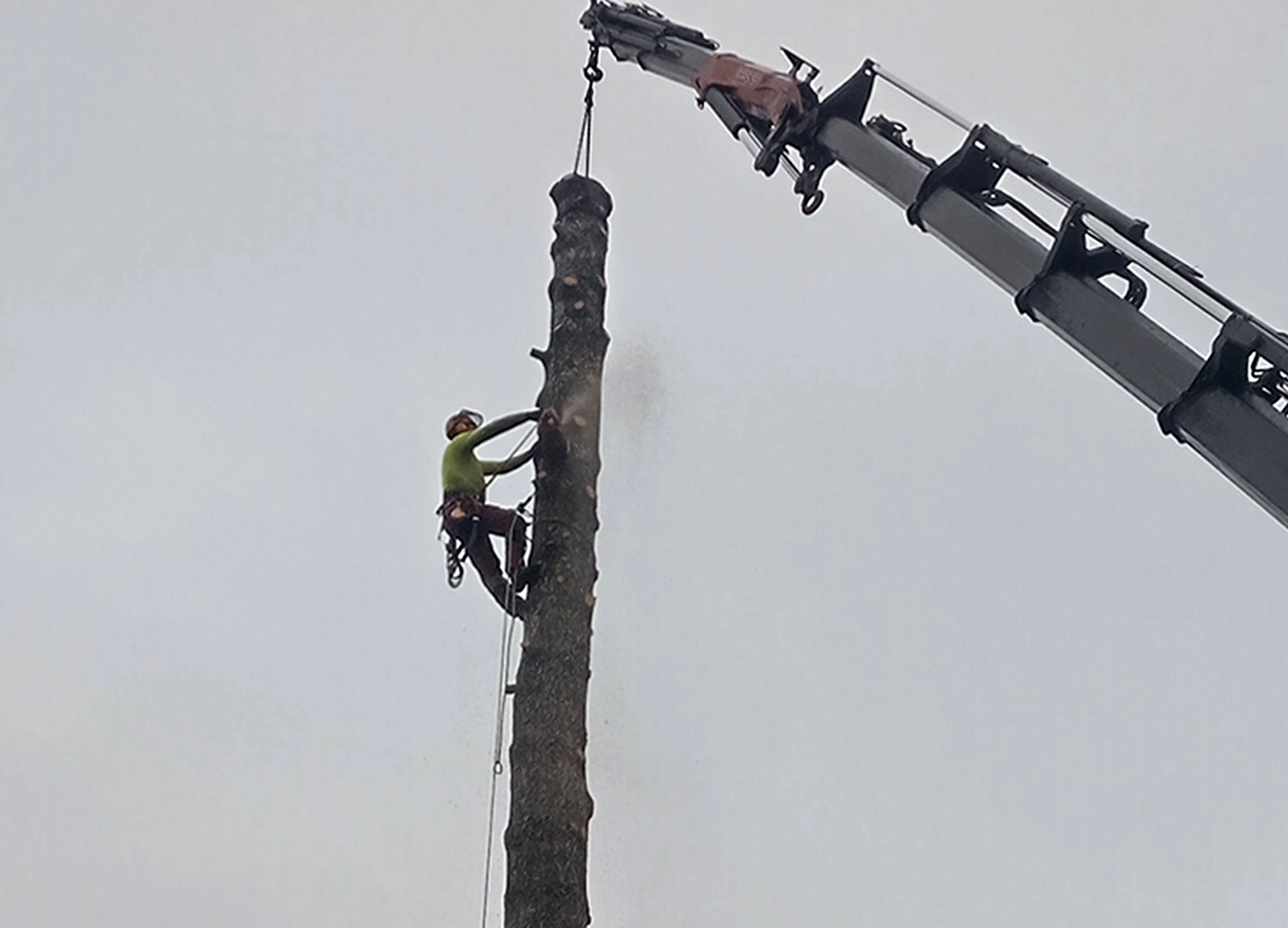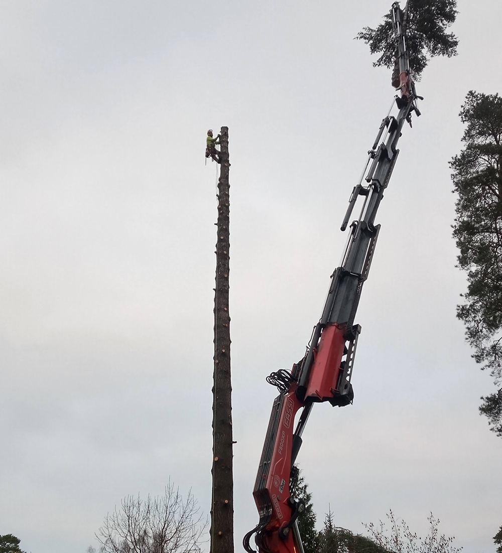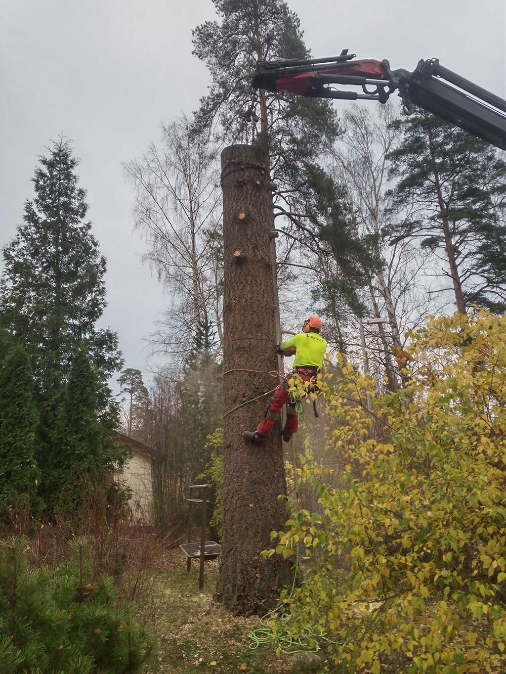 Puun poisto kiipeilytekniikoita ja nosturia käyttäen