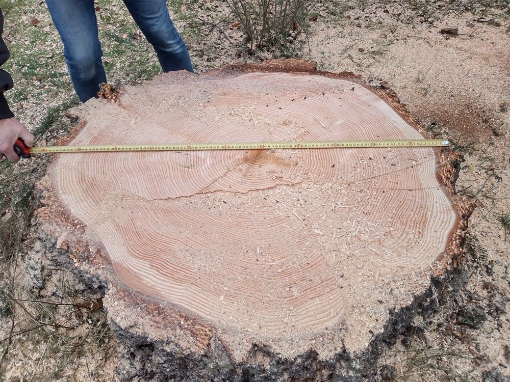 Douglaskuusen poistotyö. Puulle on suoritettu kuntoarvio ennen poistoa.