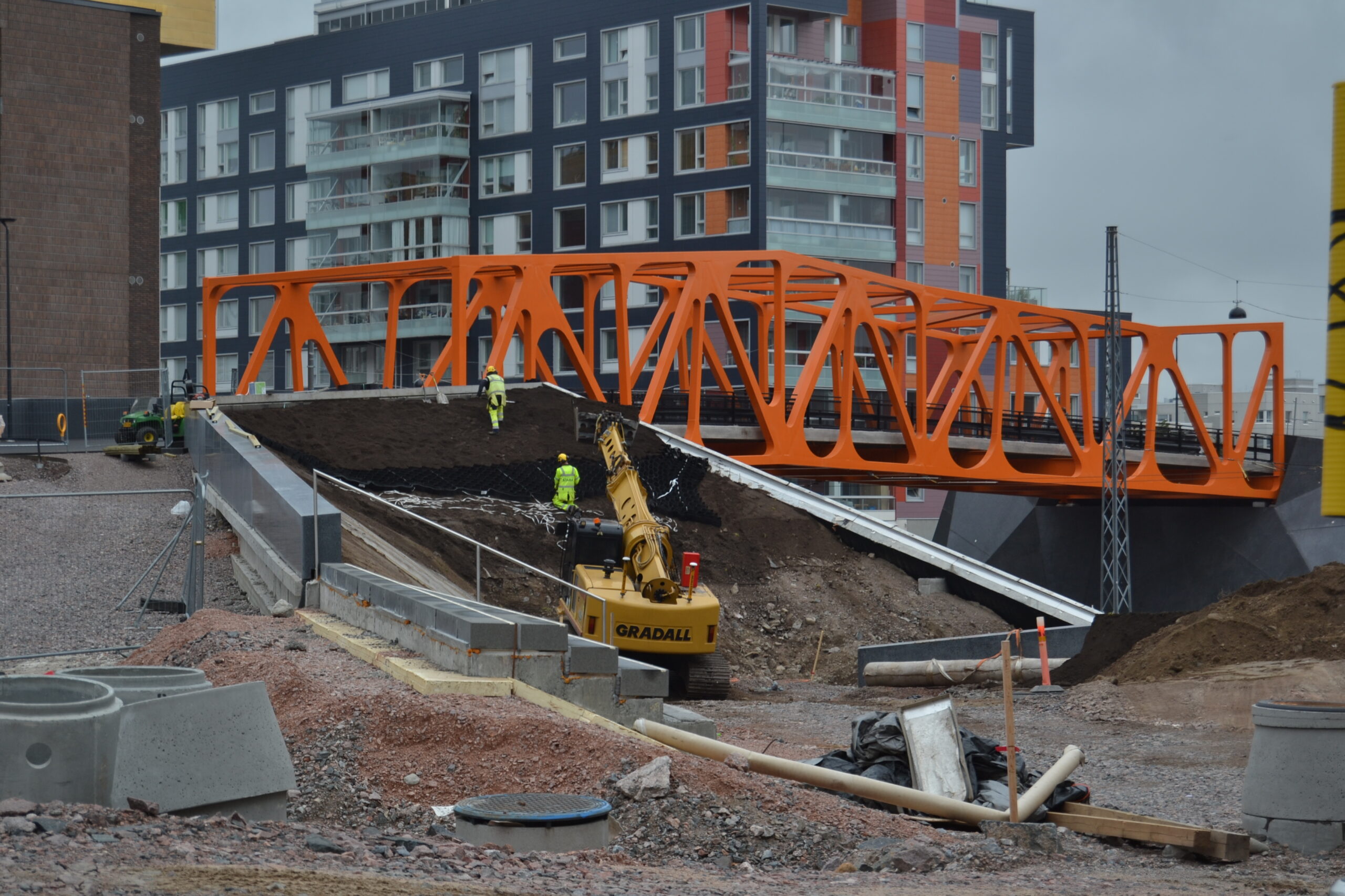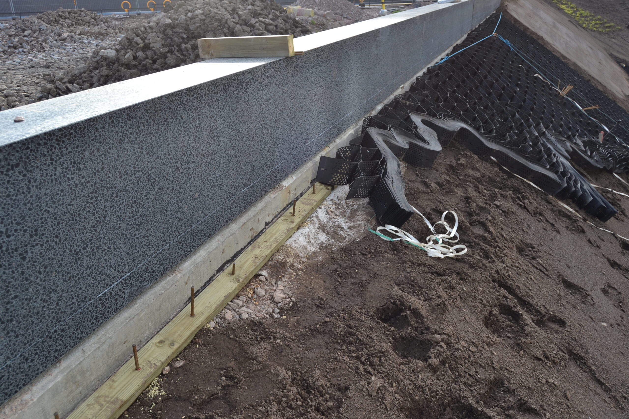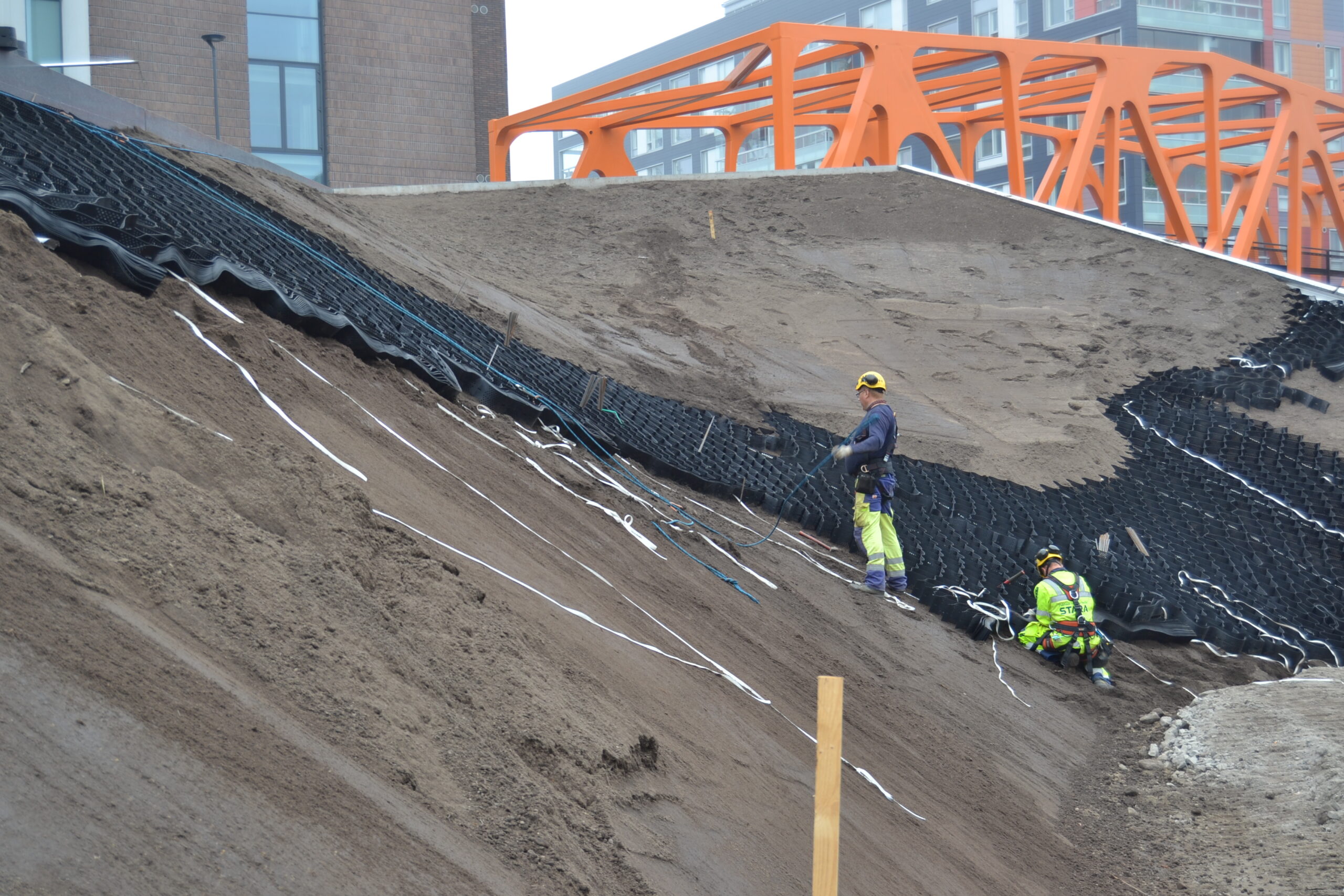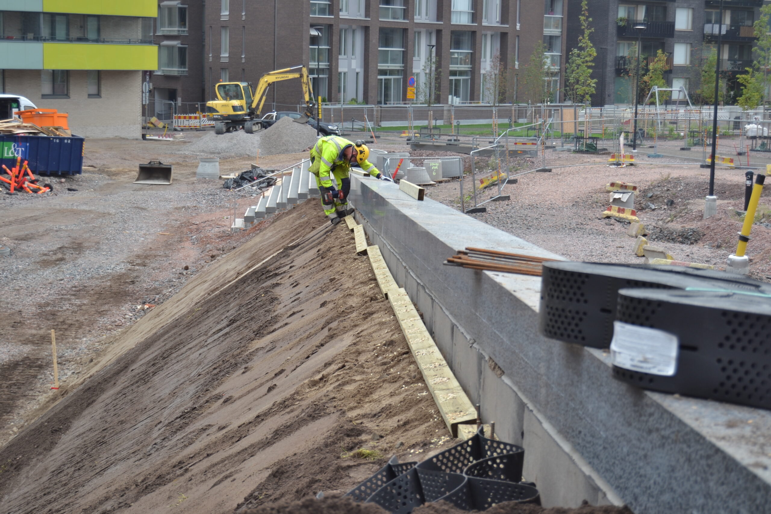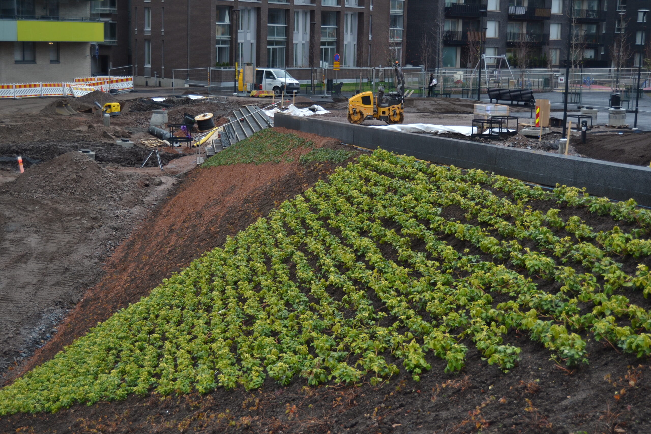 Soilweb asennusta rinteeseen Helsingin Jätkäsaaressa. Kennoihin istutettu kasvillisuutta sekä levitetty kaakaokuorikatetta pinnalle.