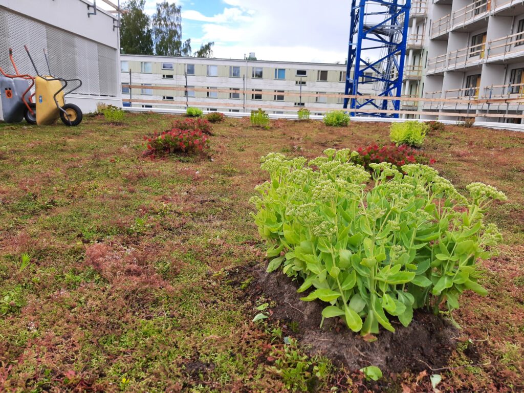 Kuninkaantammen koulu ja päiväkoti, Helsinki, 2023 Maksaruohokatolle on asennettu vedenpitoalustaksi kivivillaa ja kookosverkkoa. Niittykatolla kasvualustana on multaa, jonka päälle on asennettu Greenfix Covamat siemeneroosiomatto.