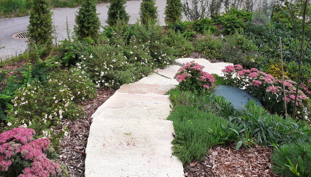 Omakotitalon piha, Sarvvik, 2022 Kellari maisemoitiin Nordic Green Roof® maksaruohomatolla ja Soilweb-kennosuojajärjestelmällä. Kellarin edusta maisemoitiin ja luotiin näkösuojaa sirotuomipihlajilla, lehti- ja havupensailla sekä perennoilla.