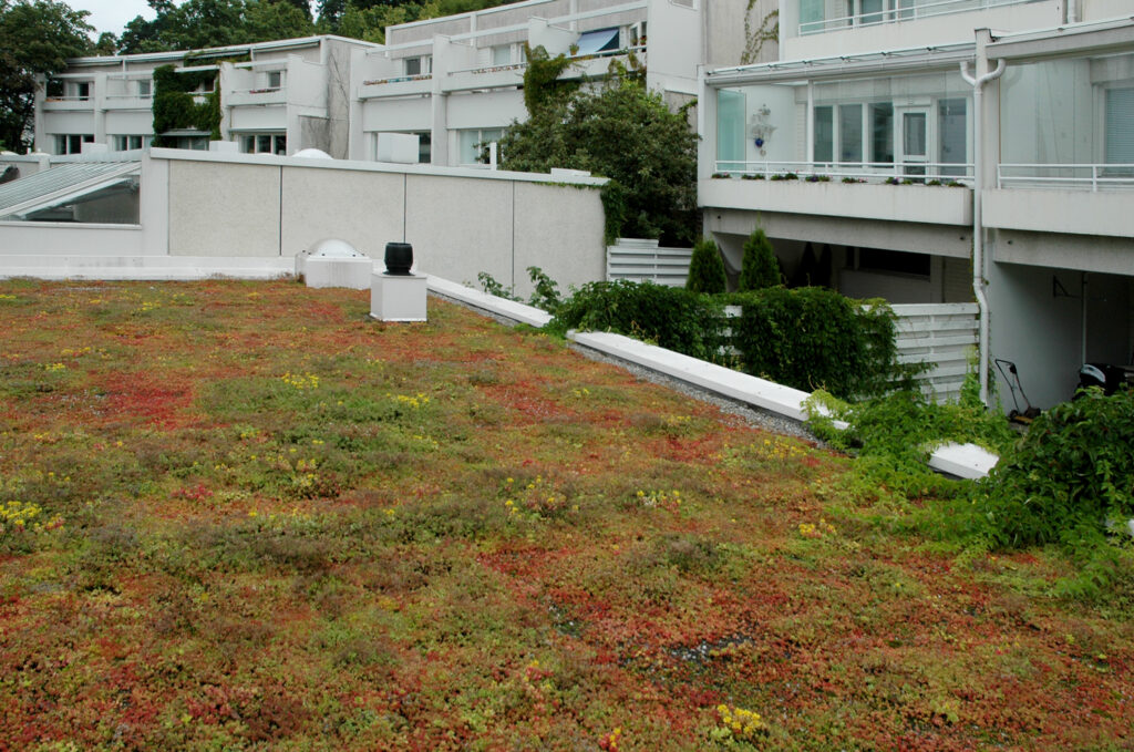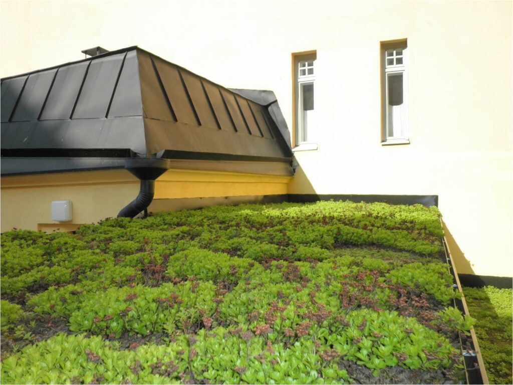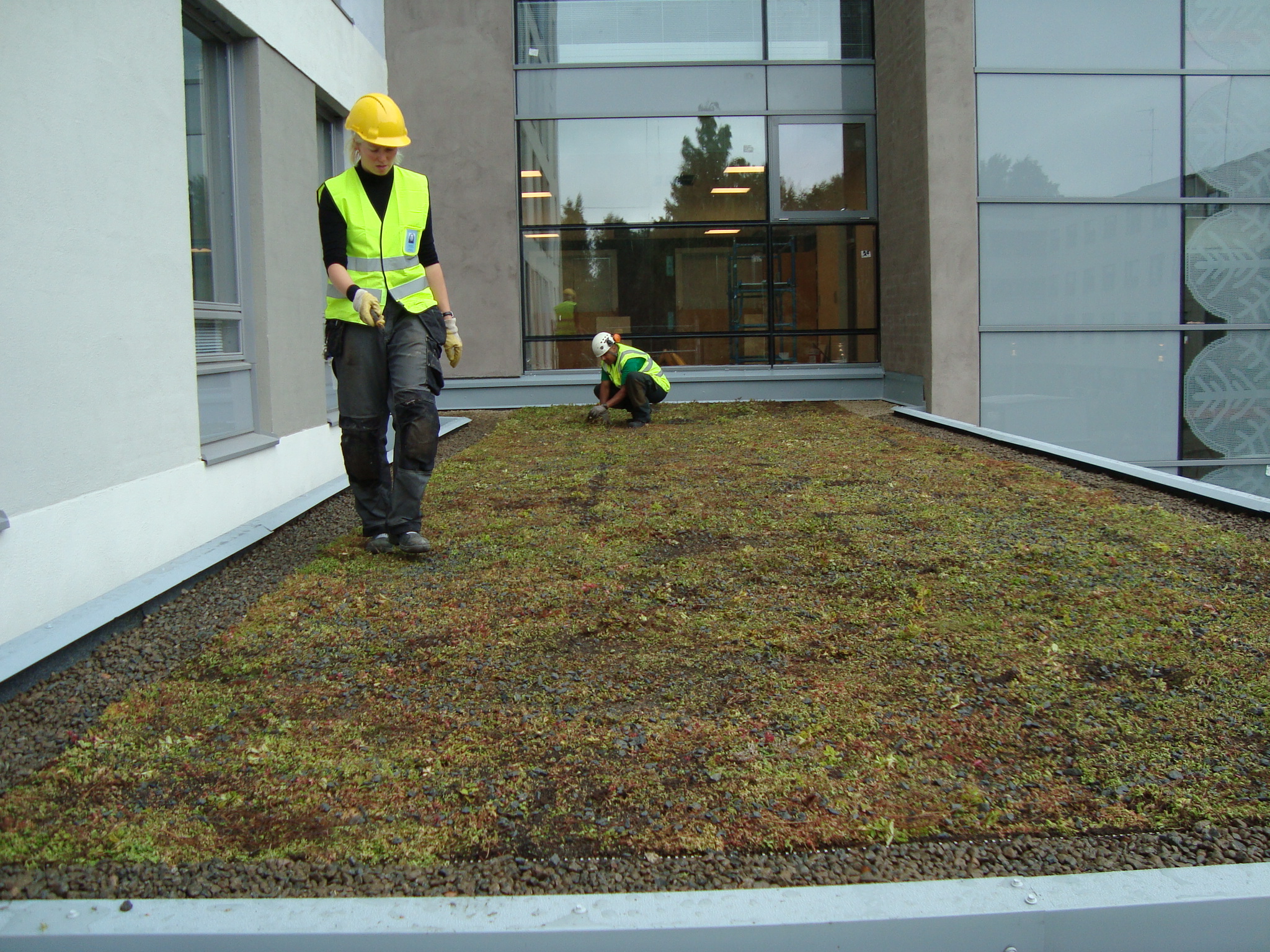Tehtaankatu, Helsinki Sisäpihan katot on toteuteutettu Nordic Green Roof® järjestelmällä. Yläkatto on paahteinen ja kaukasianmaksaruoho on vallannut alaa. Kasvusto vaihtelee kasvupaikan mukaisesti. Nordic Green Roof® kotimainen palosertifioitu maksaruohomatto kasvatetaan Tammisaaressa,