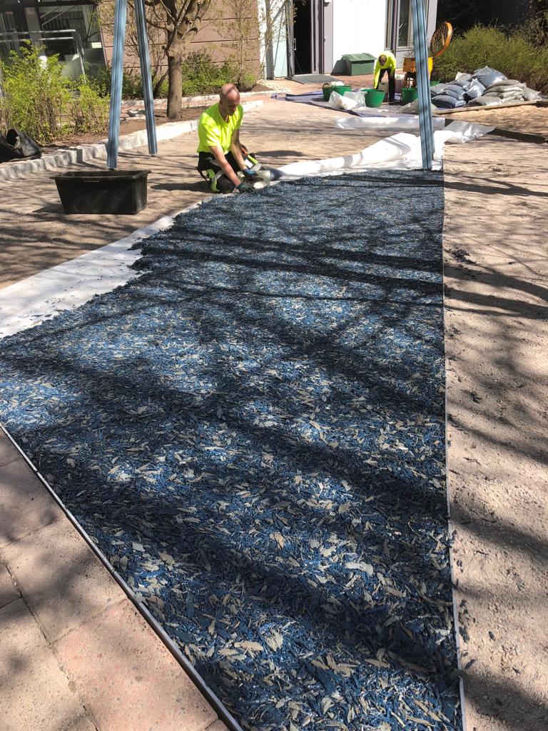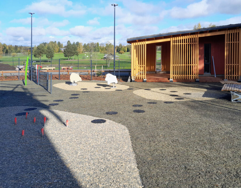 Koulukampus, Tuusulan kirkonkylä, 2023 Markkinoiden ainoa kierrätysmateriaalista valmistettu kustannustehokas turva-alusta ja eroosiopinnoite. Turvallinen ja saumaton kumipinnoite. Kumirouhe on kierrätystuote ja värjätty 100% maaväreillä.
