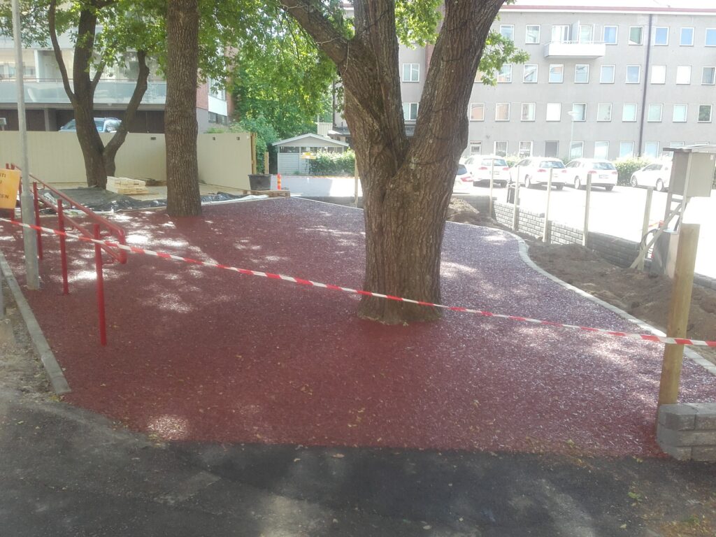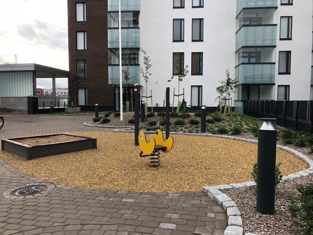 Vattuniemi, Helsinki, 2020-21 Pihaan on asennettu Ecosurface turva-alustaa, väri Supamulch, sekä istutusalueille kaakaohaketta. Lisätietoja palvelusta vihersuunnittelu ja toteutus