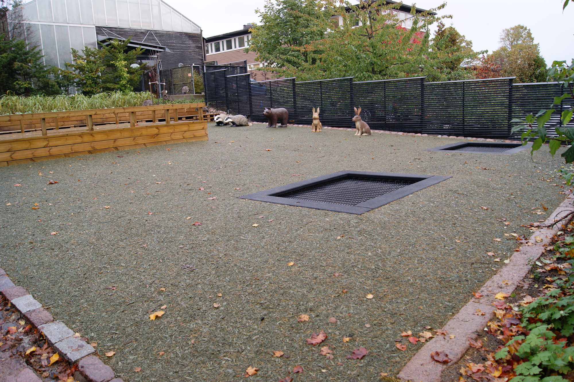 Korkeasaari, Helsinki, 2014 EcoSurface turva-alustaa valettu 40 mm maantasotrampoliinin viereen ja 30 mm eläintarhojen sisälle huoltokäytäviksi.