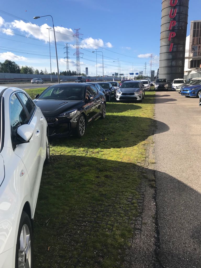 Autoliikkeen pihalla käytetty Ecorasteria maakennoa, johon kasvatettu nurmikkoa. Näin saadaan vihreä autojen paikoitusalue.