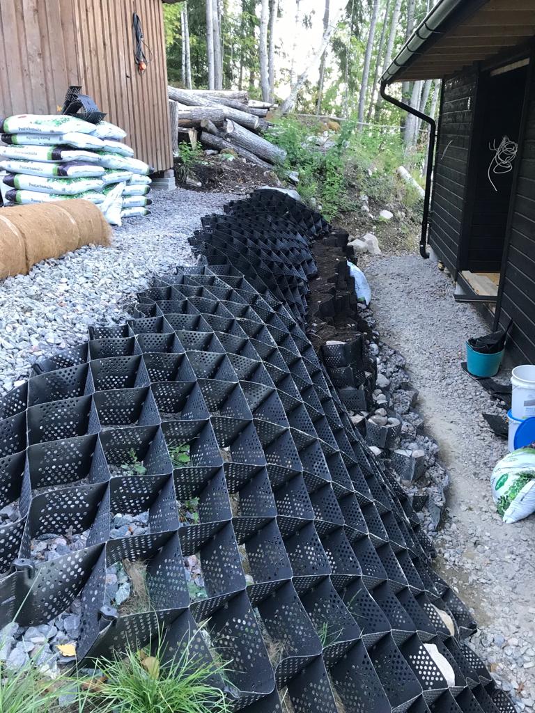 Kirkkonummi, 2019-2020 Rinnettä tuettu Soilweb kennostoilla, jonka päälle asennettu varpumattoa. Lisätietoa tuotteesta Soilweb kennosuojajärjestelmä