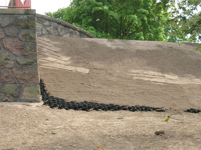Katrivalanpuisto, Helsinki, 2010 Soilweb kennostoa asennettu jyrkkiin rinteisiin. Soilwebin yläosat injektoitu kiinni harjateräksillä olemassa olevaan kallioon. Maatäyttö ja Greenfix 7 normaali kookoseroosiomatto pinnassa sekä leviävät perennat.
