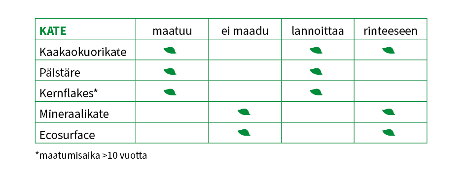 Kaakaokuorikatetta voi asentaa kaiken kasvillisuuden yhteyteen ja rinteeseen. Kaakaokuorikate ja päistäre sopivat myös kasvimaalle ja maanpeiteperennoille. Kernflakes kuorikate on pitkäikäinen.